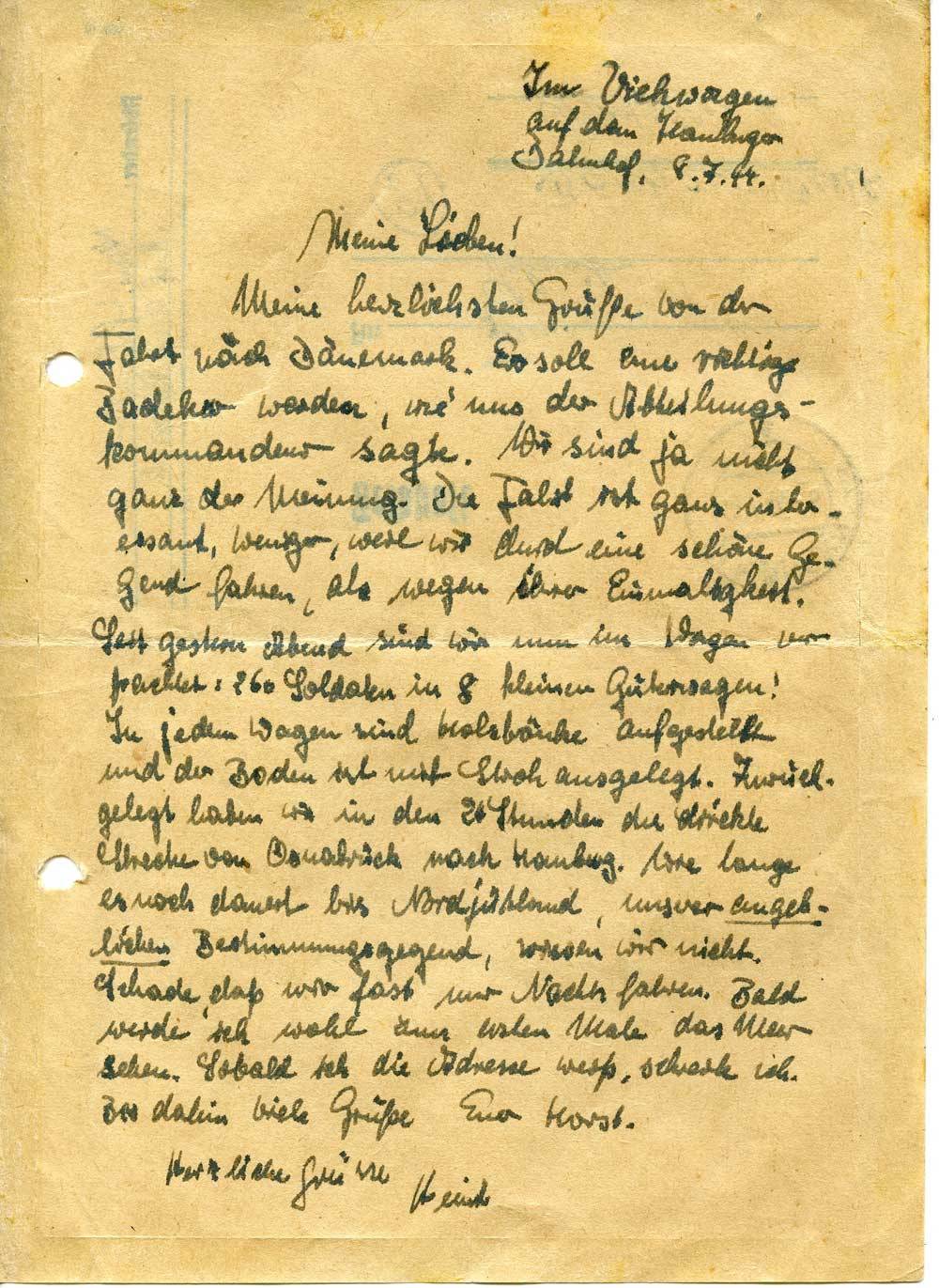 Seit gestern Abend sind wir nun im Wagen verfrachtet: 260 Soldaten in 8 kleinen Güterwagen! In jedem Wagen sind Holzbänke aufgestellt und der Boden ist mit Stroh ausgelegt. Zurückgelegt haben wir in den 24 Stunden die direkte Strecke von Osnabrück nach Hamburg. Wie lange es noch dauert bis Nordjütland, unserer angeblichen Bestimmungsgegend, wissen wir nicht. Schade, daß wir fast nur Nachts fahren. Bald werde ich wohl zum ersten Male das Meer sehen. Sobald ich die Adresse weiß, schreibe ich.