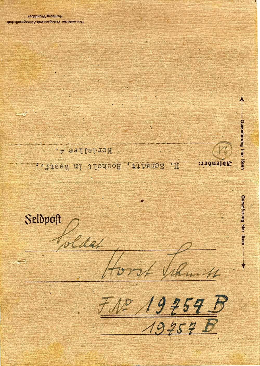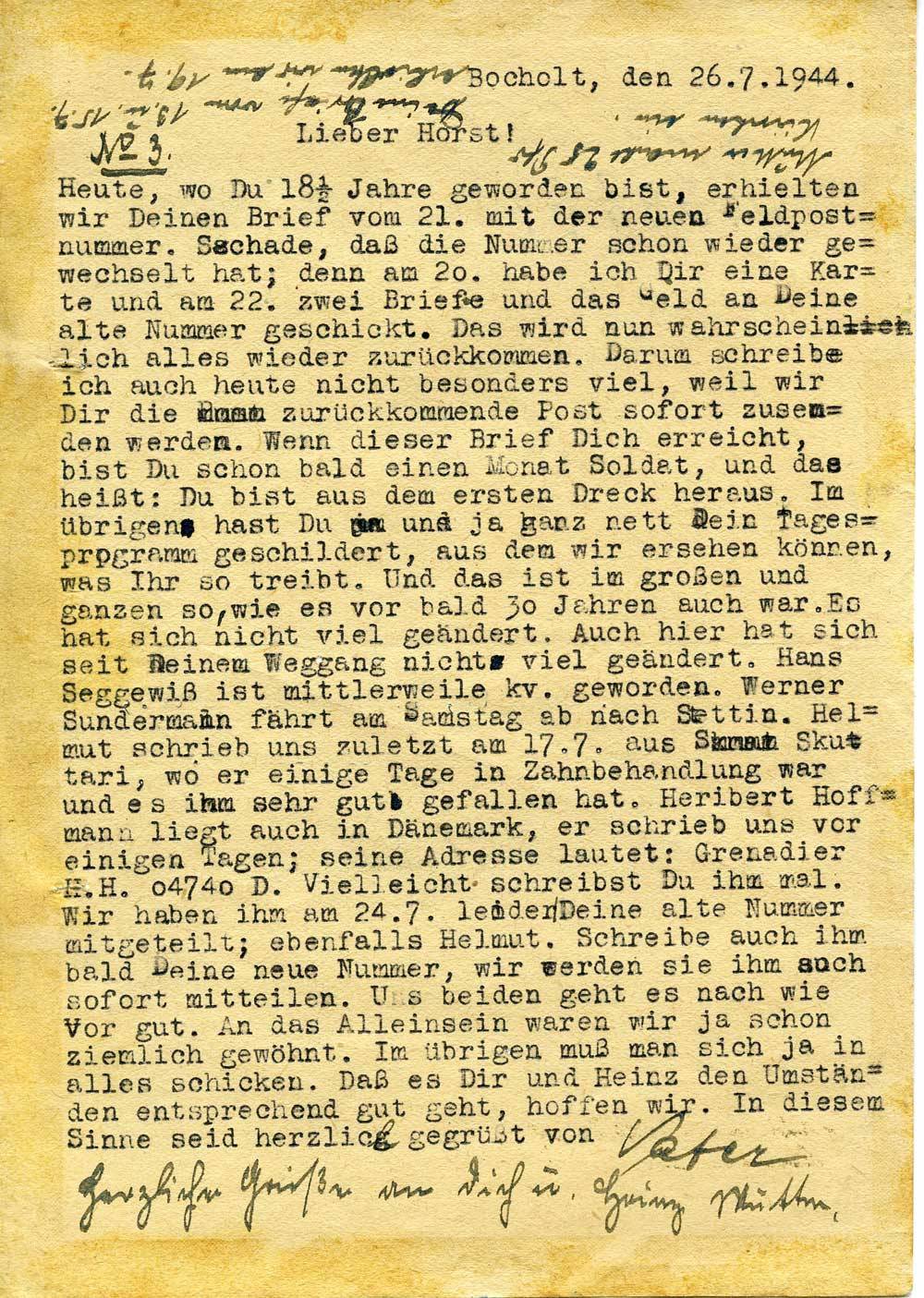 Heute, wo Du 18 ½ Jahre geworden bist, erhielten wir Deinen Brief vom 21. mit der neuen Feldpostnummer. Schade, daß die Nummer schon wieder gewechselt hat; denn am 20. habe ich Dir eine Karte und am 22. zwei Briefe und das Geld an Deine alte Nummer geschickt. Das wird nun wahrscheinlich alles wieder zurückkommen. Darum schreibe ich auch heute nicht besonders viel, weil wir Dir die zurückkommende Post sofort zusenden werden. Wenn dieser Brief Dich erreicht, bist Du schon bald einen Monat Soldat, und das heißt: Du bist aus dem ersten Dreck heraus. Im übrigen hast Du uns ja ganz nett Dein Tagesprogramm geschildert, aus dem wir ersehen können, was Ihr so treibt. Und das ist im großen und ganzen so, wie es vor bald 30 Jahren auch war. Es hat sich nicht viel geändert. Auch hier hat sich seit Deinem Weggang nicht viel geändert. Hans Seggewiß ist mittlerweile kv. geworden. Werner Sundermann fährt am Samstag ab nach Stettin. Helmut schrieb uns zuletzt am 17.7. aus Skutari, wo er einige Tage in Zahnbehandlung war und es ihm sehr gut gefallen hat. Heribert Hoffmann liegt auch in Dänemark, er schrieb uns vor einigen Tagen; seine Adresse lautet: Grenadier H. H. 04740 D. Vielleicht schreibst Du ihm mal. Wir haben ihm am 24.7. leider Deine alte Nummer mitgeteilt; ebenfalls Helmut. Schreibe auch ihm bald Deine neue Nummer, wir werden sie ihm auch sofort mitteilen. Uns beiden geht es nach wie vor gut. An das Alleinsein waren wir ja schon ziemlich gewöhnt. Im übrigen muß man sich ja in alles schicken. Daß es Dir und Heinz den Umständen entsprechend gut geht, hoffen wir. In diesem Sinne seid herzlich gegrüßt von Vater.
