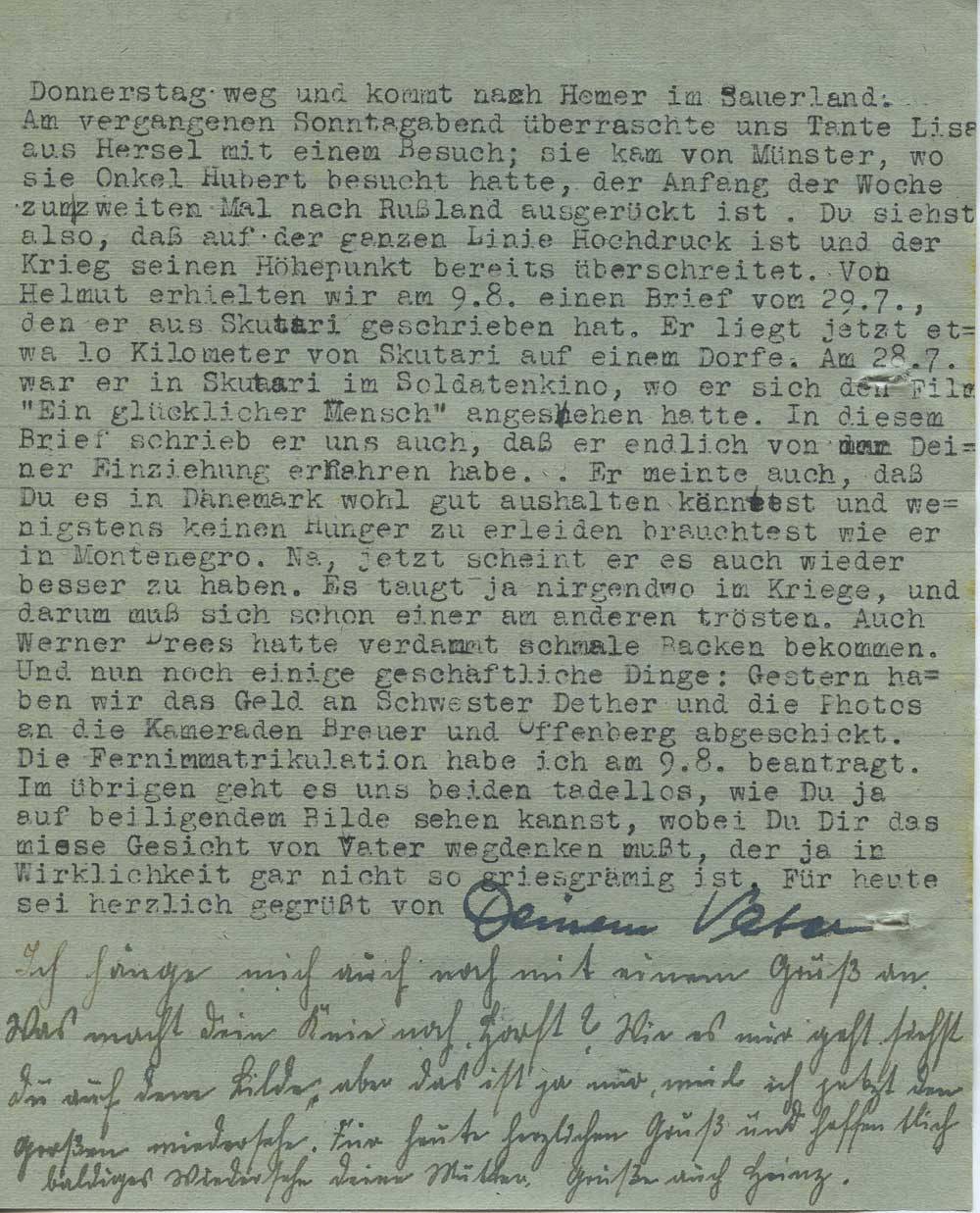 Am vergangenen Sonntagabend überraschte uns Tante Lisa aus Hersel mit einem Besuch; sie kam von Münster, wo sie Onkel Hubert besucht hatte, der Anfang der Woche zum zweiten Mal nach Rußland ausgerückt ist. Du siehst also, daß auf der ganzen Linie Hochdruck ist und der Krieg seinen Höhepunkt bereits überschreitet. Von Helmut erhielten wir am 9.8. einen Brief vom 29.7., den er aus Skutari geschrieben hat. Er liegt jetzt etwa 10 Kilometer von Skutari auf einem Dorfe. Am 28.7. war er in Skutari im Soldatenkino, wo er sich den Film „Ein glücklicher Mensch“ angesehen hatte. In diesem Brief schrieb er uns auch, daß er endlich von Deiner Einziehung erfahren habe. . Er meinte auch, daß Du es in Dänemark wohl gut aushalten könntest und wenigstens keinen Hunger zu erleiden brauchtest wie er in Montenegro. Na, jetzt scheint er es auch wieder besser zu haben. Es taugt ja nirgendwo im Kriege, und darum muß sich schon einer am anderen trösten. Auch Werner Drees hatte verdammt schmale Backen bekommen. Und nun noch einige geschäftliche Dinge: Gestern haben wir das Geld an Schwester Dether und die Photos an die Kameraden Breuer und Offenberg abgeschickt. Die Fernimmatrikulation habe ich am 9.8. beantragt. Im übrigen geht es uns beiden tadellos, wie Du ja auf beiliegendem Bilde sehen kannst, wobei Du Dir das miese Gesicht von Vater wegdenken mußt, der ja in Wirklichkeit gar nicht so griesgrämig ist. Für heute sei herzlich gegrüßt von