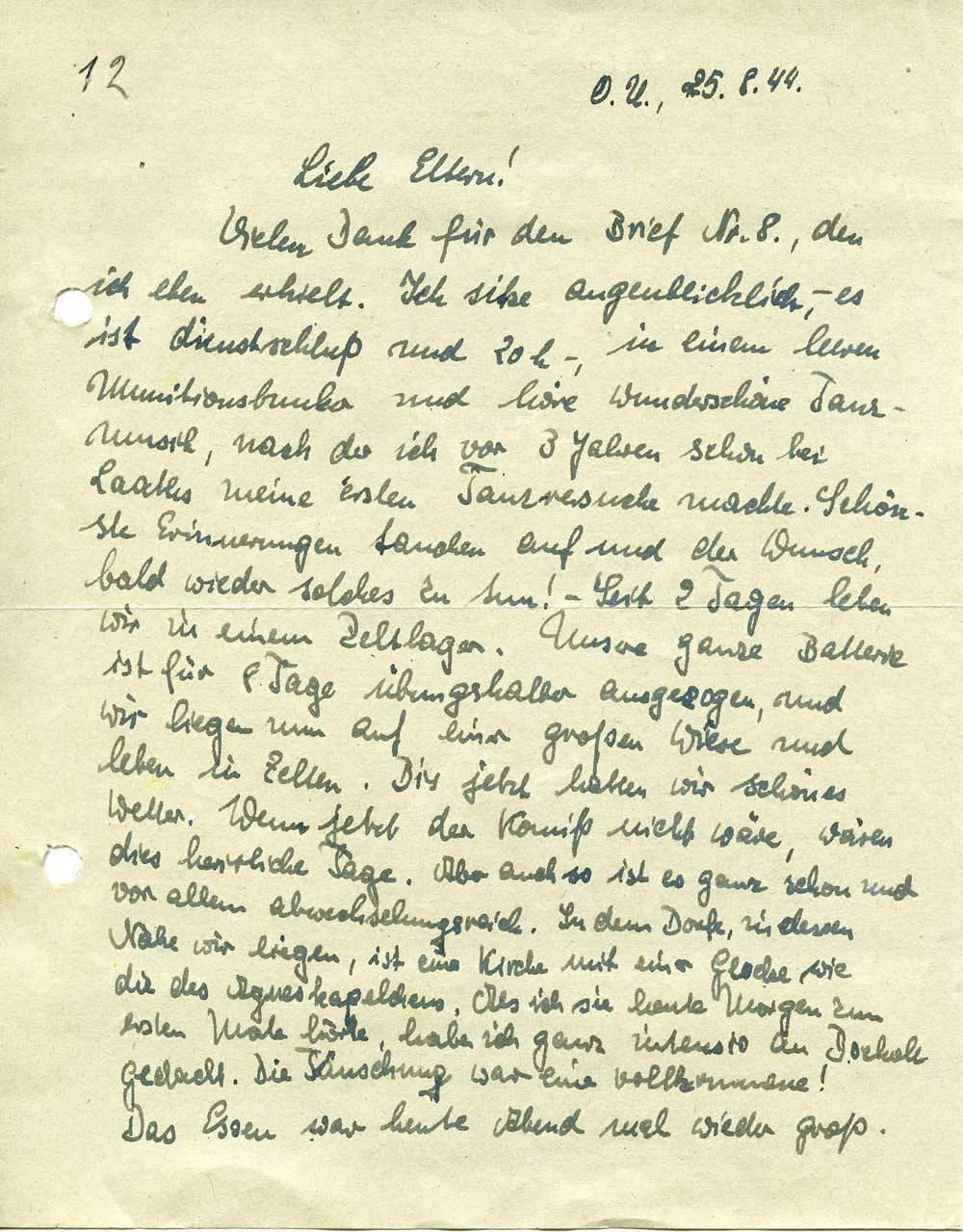 Vielen Dank für den Brief Nr. 8., den ich eben erhielt. Ich sitze augenblicklich, - es ist Dienstschluß und 20 h -, in einem leeren Munitionsbunker und höre wunderschöne Tanzmusik, nach der ich vor 3 Jahren schon bei Laaths meine ersten Tanzversuche machte. Schönste Erinnerungen tauchen auf und der Wunsch, bald wieder solches zu tun! – Seit 2 Tagen leben wir in einem Zeltlager. Unsere ganze Batterie ist für 8 Tage übungshalber ausgezogen, und wir liegen nun auf einer großen Wiese und leben in Zelten. Bis jetzt hatten wir schönes Wetter. Wenn jetzt der Komiß nicht wäre, wären dies herrliche Tage. Aber auch so ist es ganz schön und vor allem abwechslungsreich. In dem Dorfe, in dessen Nähe wir liegen, ist eine Kirche mit einer Glocke wie die des Agneskapellchens. Als ich sie heute Morgen zum ersten Male hörte, habe ich ganz intensiv an Bocholt gedacht. Die Täuschung war eine vollkommene!