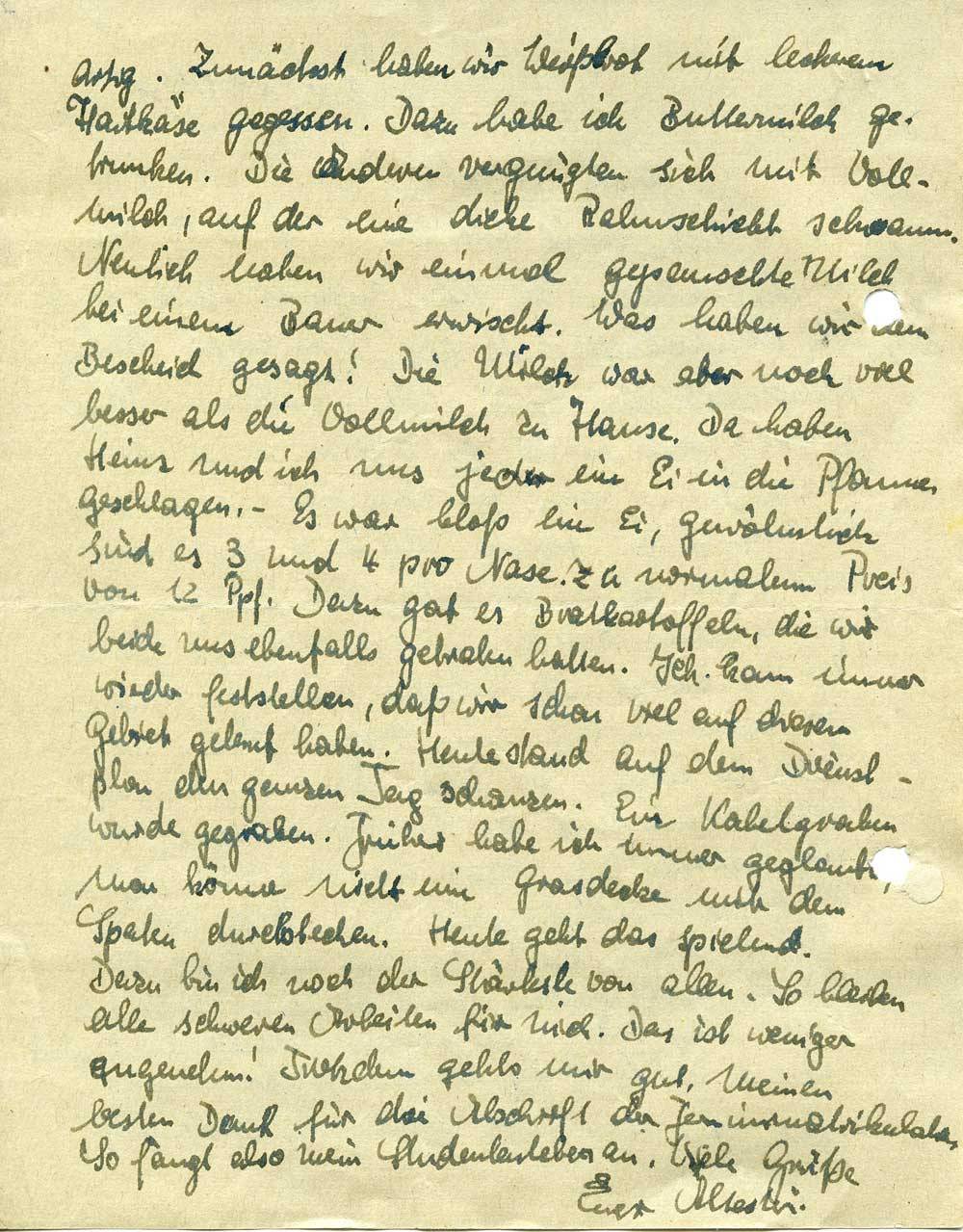 artig. Zunächst haben wir Weißbrot mit leckerem Hartkäse gegessen. Dazu habe ich Buttermilch getrunken. Die Anderen vergnügten sich mit Vollmilch, auf der eine dicke Rahmschicht schwamm. Neulich haben wir einmal gepanschte Milch bei einem Bauer erwischt. Was haben wir dem Bescheid gesagt! Die Milch war aber noch viel besser als die Vollmilch zu Hause. Da haben Heinz und ich uns jeder ein Ei in die Pfanne geschlagen. – Es war bloß ein Ei, gewöhnlich sind es 3 oder 4 pro Nase. Zu normalem Preis von 12 Ppf. Dazu gab es Bratkartoffeln, die wir beide uns ebenfalls gebraten hatten. Ich kann immer wieder feststellen, daß wir schon viel auf diesem Gebiet gelernt haben. Heute stand auf dem Dienstplan den ganzen Tag schanzen. Ein Kabelgraben wurde gegraben. Früher habe ich immer geglaubt, man könne nicht eine Grasdecke mit dem Spaten durchstechen. Heute geht das spielend. Dazu bin ich noch der Stärkste von allen. So bleiben alle schweren Arbeiten für mich. Das ist weniger angenehm! Trotzdem gehts mir gut. Meinen besten Dank für die Abschrift der Fernimmatrikulation. So fängt also mein Studentenleben an. Viele Grüße