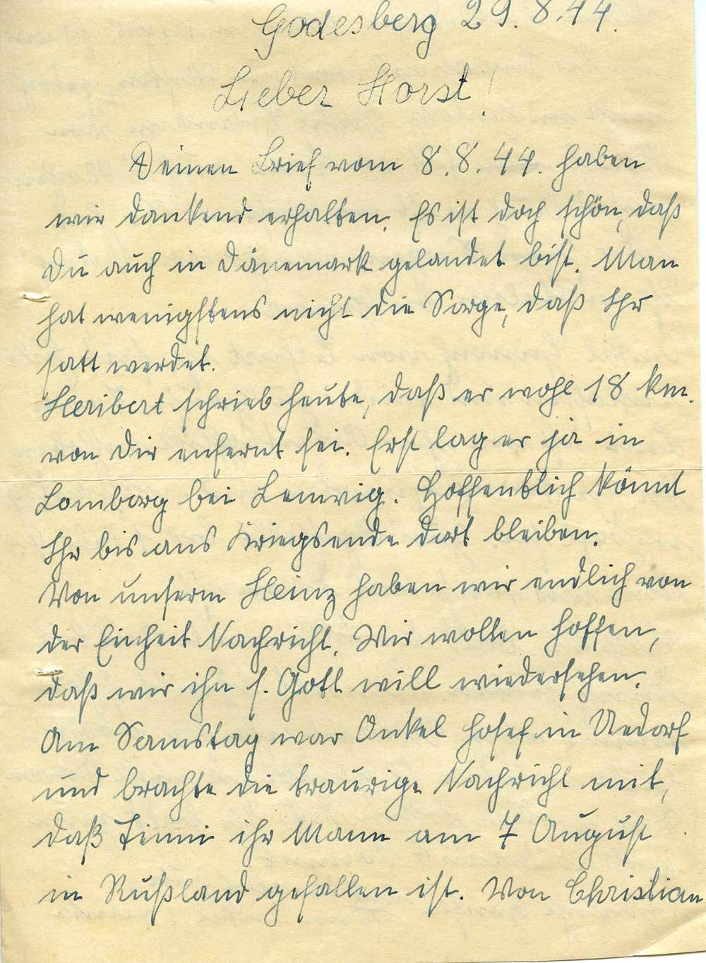 Deinen Brief vom 8.8.44. haben wir dankend erhalten. Es ist doch schön, daß Du auch in Dänemark gelandet bist. Man hat wenigstens nicht die Sorge, daß Ihr satt werdet.