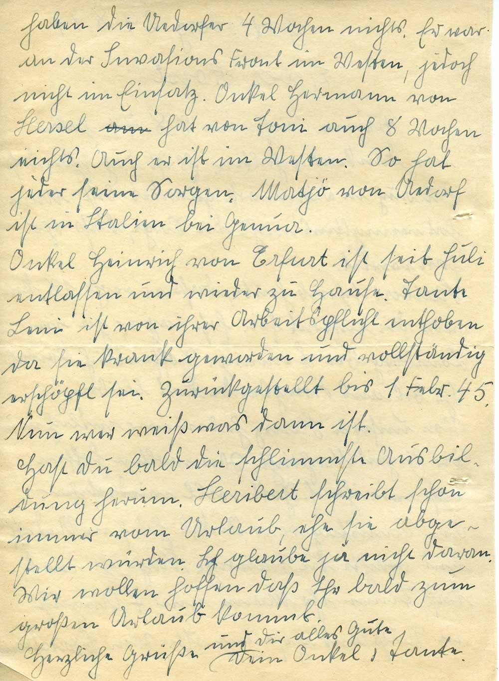 Onkel Heinrich von Erfurt ist seit Juli entlassen und wieder zu Hause. Tante Leni ist von ihrer Arbeitspflicht enthoben da sie krank geworden und vollständig erschöpft sei. Zurückgestellt bis 1. Febr. 45. Nun wer weiß was dann ist.