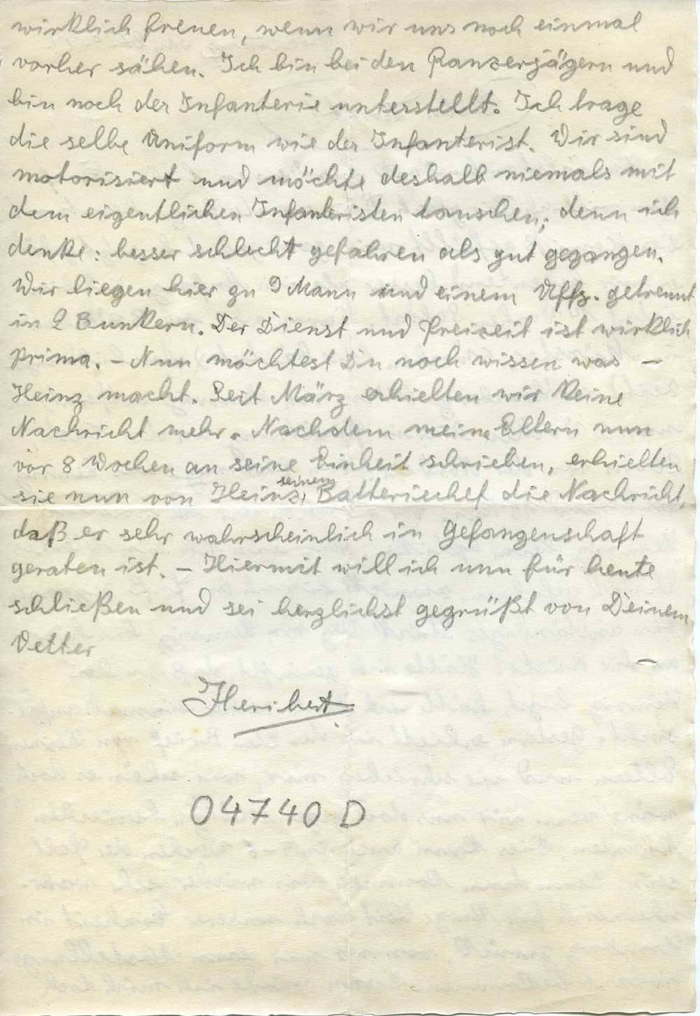 wirklich freuen, wenn wir uns noch einmal vorher sähen. Ich bin bei den Panzerjägern und bin noch der Infanterie unterstellt. Ich trage die selbe Uniform wie der Infanterist. Wir sind motorisiert und möchte deshalb niemals mit dem eigentlichen Infanteristen tauschen; denn ich denke: besser schlecht gefahren als gut gegangen. Wir liegen hier zu 9 Mann und einem Uffz. getrennt in 2 Bunkern. Der Dienst und Freizeit ist wirklich prima. – Nun möchtest Du noch wissen was – Heinz macht. Seit März erhielten wir keine Nachricht mehr. Nachdem meine Eltern nun vor 8 Wochen an seine Einheit schrieben, erhielten wir nun von Heinz seinem Batteriechef die Nachricht, daß er sehr wahrscheinlich in Gefangenschaft geraten ist. – Hiermit will ich nun für heute schließen und sei herzlichst gegrüßt von Deinem Vetter