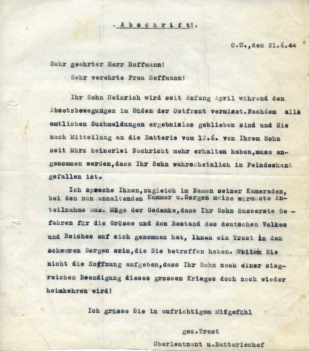 Ihr Sohn Heinrich wird seit Anfang April während den Absetzbewegungen im Süden der Ostfront vermisst. Nachdem alle amtlichen Suchmeldungen ergebnislos geblieben sind und Sie nach Mitteilung an die Batterie vom 12.6. von Ihrem Sohn seit März keinerlei Nachricht mehr erhalten haben, muss angenommen werden, dass Ihr Sohn wahrscheinlich in Feindeshand gefallen ist.