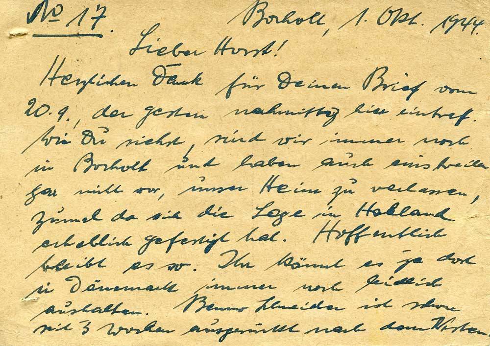 Herzlichen Dank für Deinen Brief vom 20.9., der gestern nachmittag hier eintraf. Wie Du siehst, sind wir immer noch in Bocholt und haben auch einstweilen gar nicht vor, unser Heim zu verlassen, zumal da sich die Lage in Holland erheblich gefestigt hat. Hoffentlich bleibt es so. Ihr könnt es ja dort in Dänemark immer noch leidlich aushalten. Benno Schneider ist schon seit 3 Wochen ausgerückt nach dem Westen.