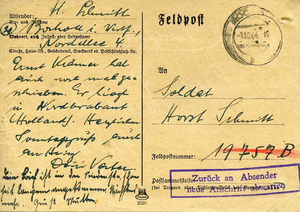 Vater und Mutter Schmitt an Sohn Horst, 1. Oktober 1944