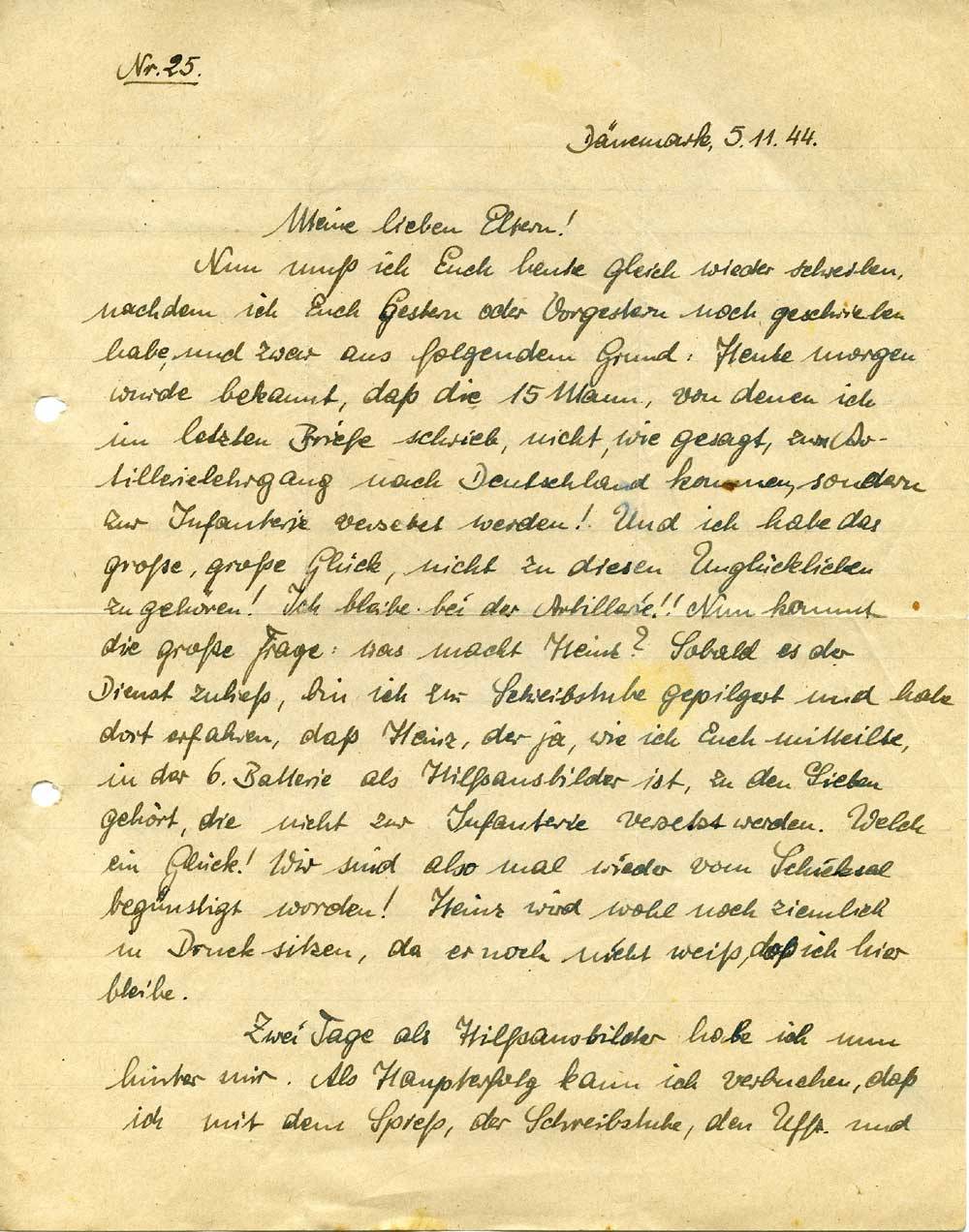 Nun muß ich Euch heute gleich wieder schreiben, nachdem ich Euch Gestern oder Vorgestern noch geschrieben habe, und zwar aus folgendem Grund: Heute morgen wurde bekannt, daß die 15 Mann, von denen ich im letzten Briefe schrieb, nicht, wie gesagt, zum Artillerielehrgang nach Deutschland kommen, sondern zur Infanterie versetzt werden! Und ich habe das große, große Glück, nicht zu diesen Unglücklichen zu gehören! Ich bleibe bei der Artillerie!! Nun kommt die große Frage: was macht Heinz? Sobald es der Dienst zuließ, bin ich zur Schreibstube gepilgert und habe dort erfahren, daß Heinz, der ja, wie ich Euch mitteilte, in der 6. Batterie als Hilfsausbilder ist, zu den Sieben gehört, die nicht zur Infanterie versetzt werden. Welch ein Glück! Wir sind also mal wieder vom Schicksal begünstigt worden! Heinz wird wohl noch ziemlich in Druck sitzen, da er noch nicht weiß, daß ich hier bleibe.