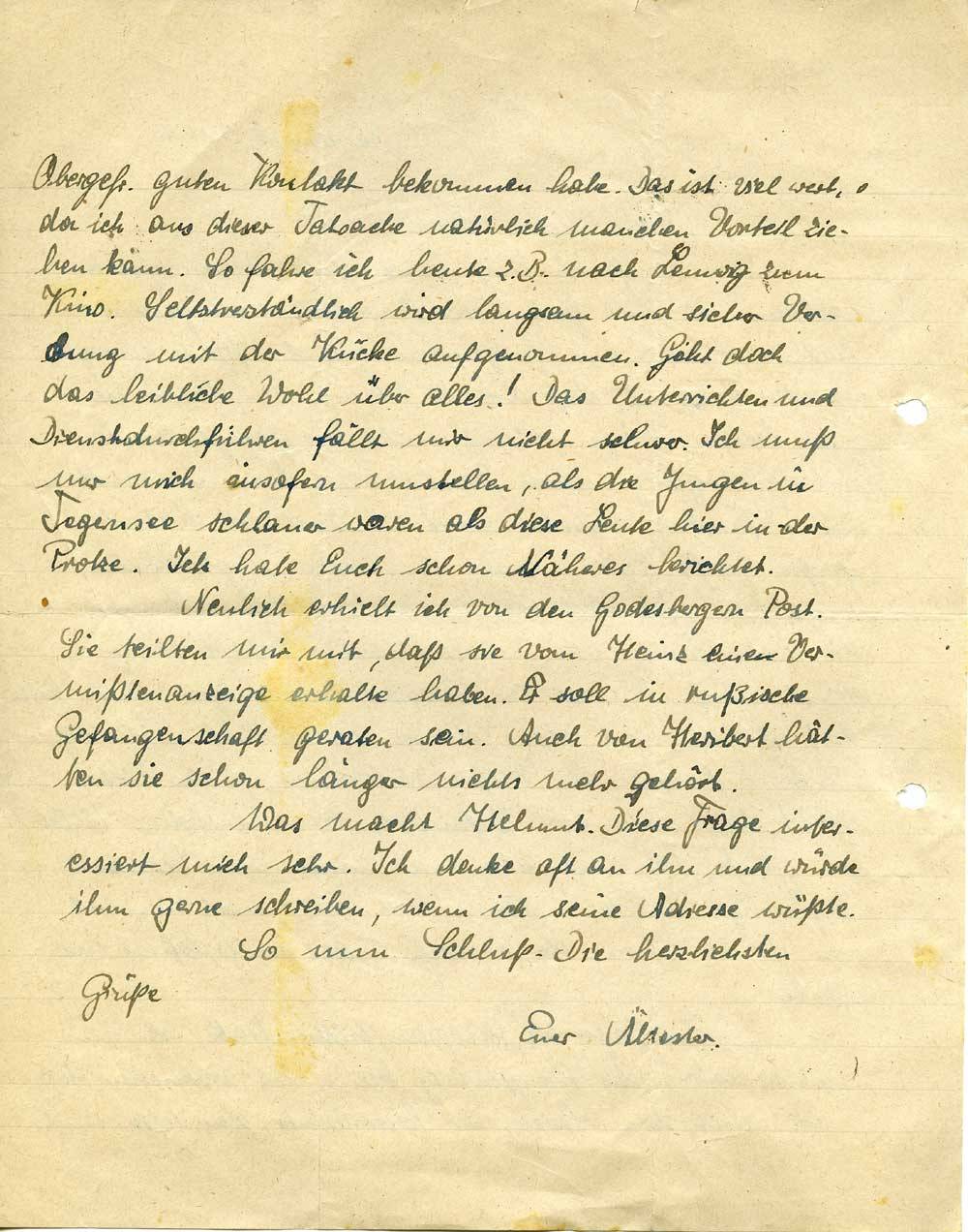 Neulich erhielt ich von den Godesbergern Post. Sie teilten mir mit, daß sie vom Heinz eine Vermißtenanzeige erhalten haben. Er soll in rußische Gefangenschaft geraten sein. Auch von Heribert hätten sie schon länger nichts mehr gehört.