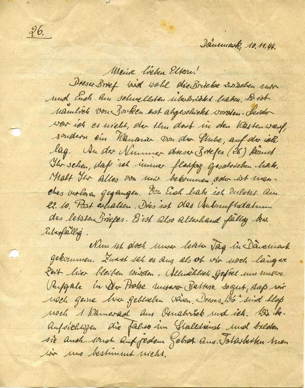 Dieser Brief wird wohl die Brücke zwischen mir und Euch am schnellsten überbrückt haben. Er ist nämlich von Borken erst abgeschickt worden. Leider war ich es nicht, der ihn dort in den Kasten warf, sondern ein Kanonier von der Stube, auf der ich lag. An der Nummer dieses Briefes (26.) könnt Ihr sehen, daß ich immer fleißig geschrieben habe. Habt Ihr alles von mir bekommen, oder ist manches verloren gegangen. Von Euch habe ich zuletzt am 22.10. Post erhalten. Dies ist das Ankunftsdatum des letzten Briefes. Es ist also allerhand fällig bzw. überfällig.