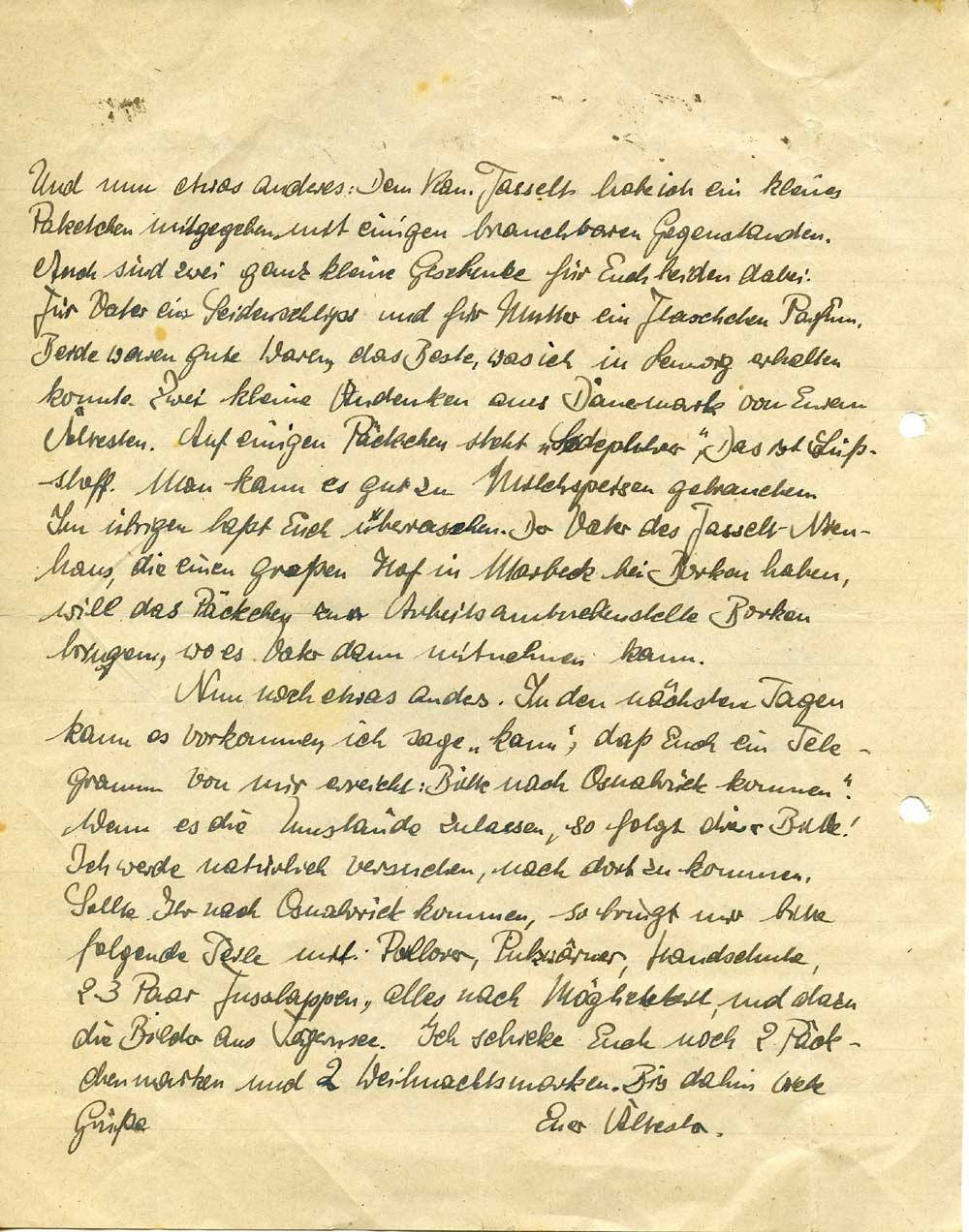 Nun noch etwas anders. In den nächsten Tagen kann es vorkommen, ich sage „kann“, daß Euch ein Telegramm von mir erreicht: „Bitte nach Osnabrück kommen“. Wenn es die Umstände zulassen, so folgt dieser Bitte! Ich werde natürlich versuchen, nach dort zu kommen. Sollte Ihr nach Osnabrück kommen, so bringt mir bitte folgende Teile mit: Pullover, Pulzwärmer, Handschuhe, 23 Paar Fusslappen, alles nach Möglichkeit, und dazu die Bilder aus Tegernsee. Ich schicke Euch noch 2 Päckchenmarken und 2 Weihnachtsmarken. Bis dahin liebe Grüße