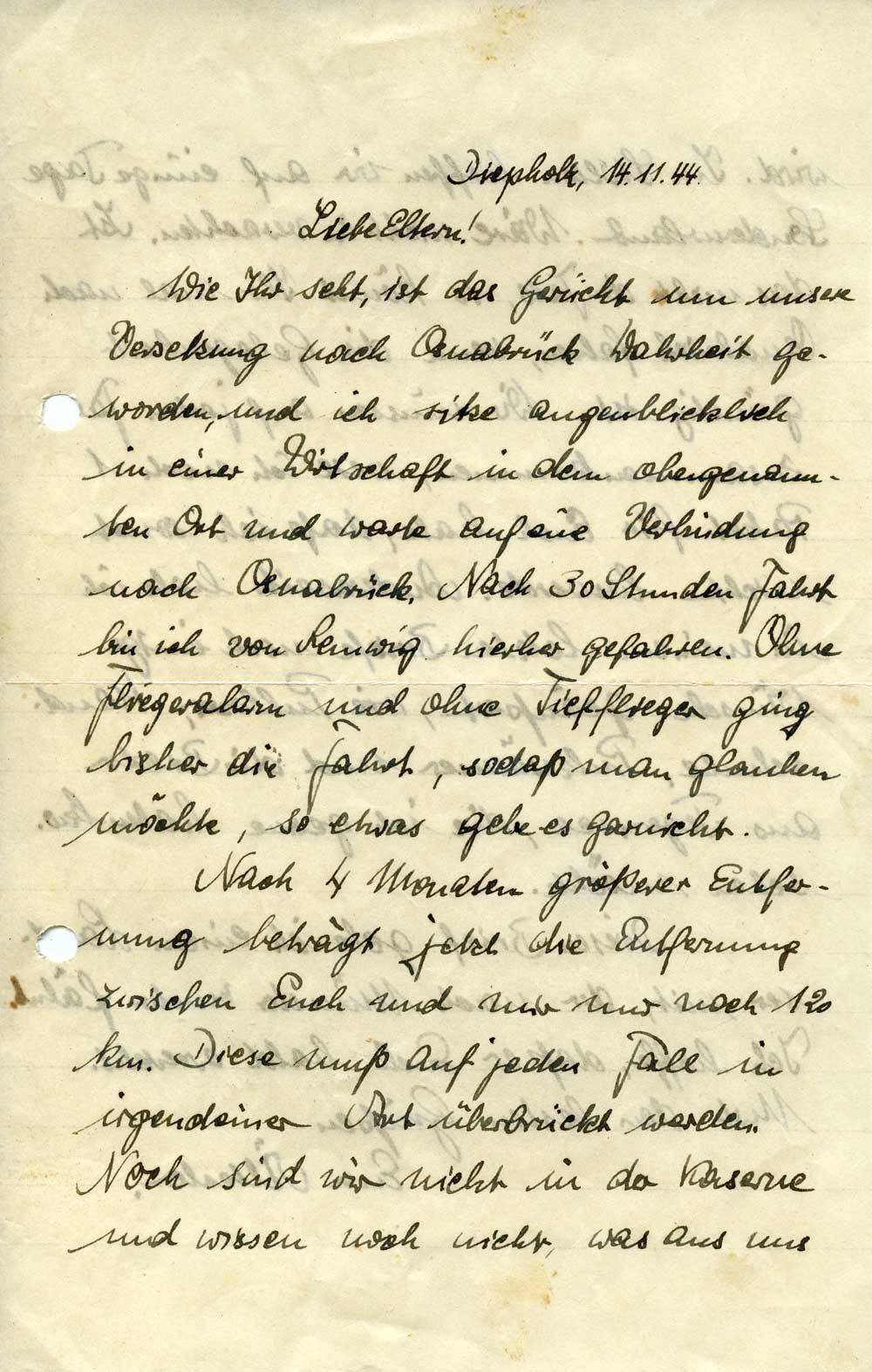 Wie Ihr sehr, ist das Gerücht um unsere Versetzung nach Osnabrück Wahrheit geworden, und ich sitze augenblicklich in einer Wirtschaft in dem obengenannten Ort und warte auf eine Verbindung nach Osnabrück. Nach 30 Stunden Fahrt bin ich von Lemvig hierher gefahren. Ohne Fliegeralarm und ohne Tiefflieger ging bisher die Fahrt, sodaß man glauben möchte, so etwas gebe es garnicht.