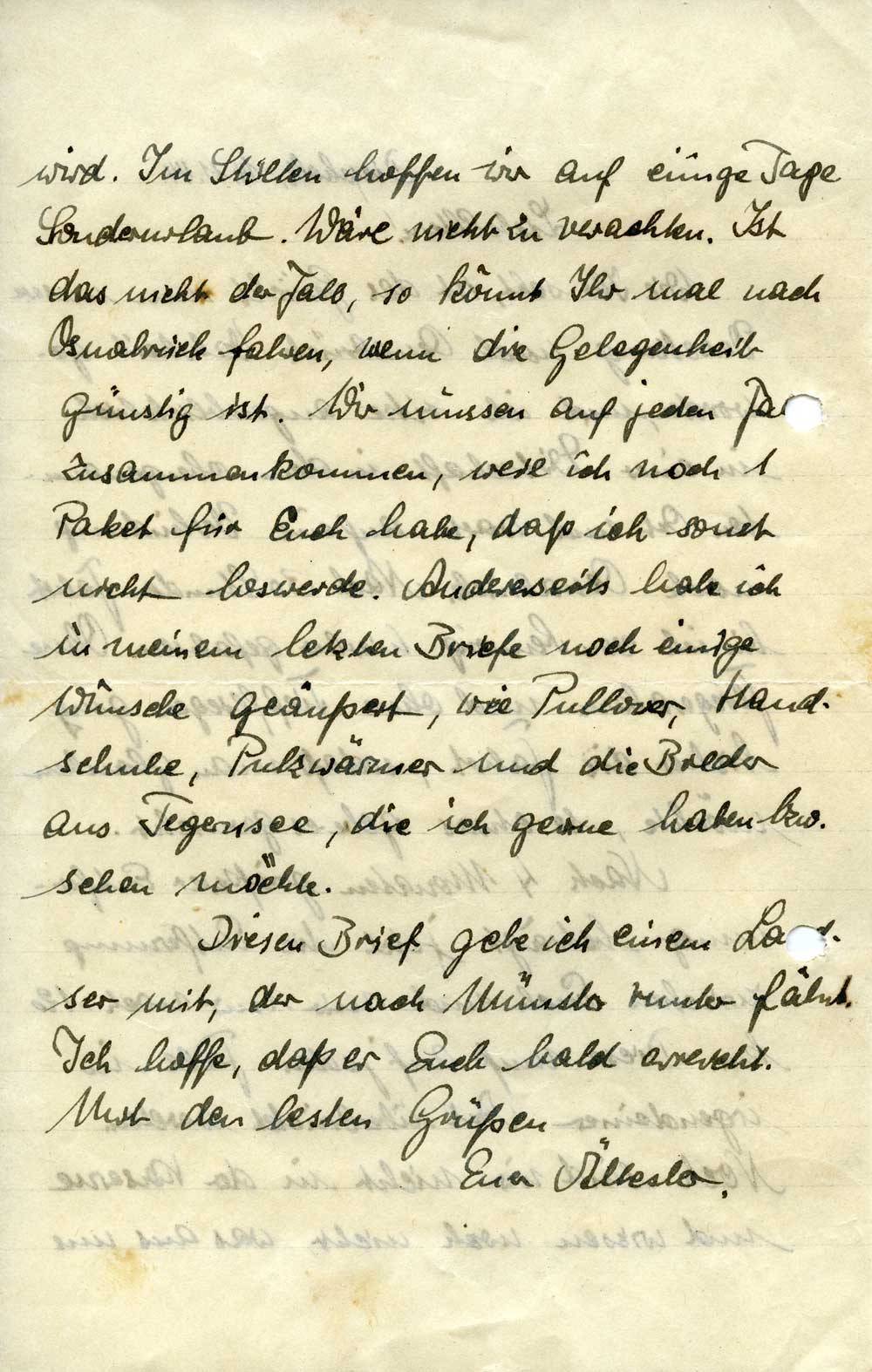 wird. Im Stillen hoffen wir auf einige Tage Sonderurlaub. Wäre nicht zu verachten. Ist das nicht der Fall, so könnt Ihr mal nach Osnabrück fahren, wenn die Gelegenheit günstig ist. Wir müssen auf jeden Fall zusammenkommen, weil ich noch 1 Paket für Euch habe, daß ich sonst nicht loswerde. Andererseits habe ich in meinem letzten Briefe noch einige Wünsche geäußert, wie Pullover, Handschuhe, Pulzwärmer und die Bilder aus Tegernsee, die ich gerne haben bzw. sehen möchte.