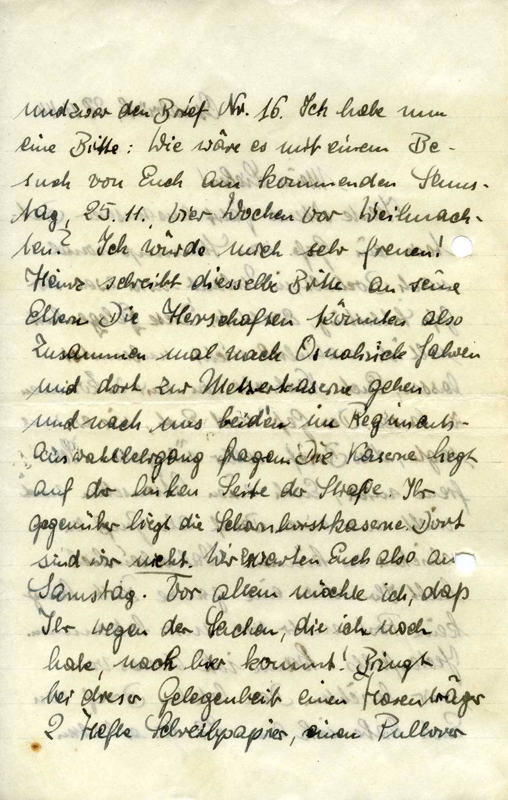und zwar den Brief Nr. 16. Ich habe nun eine Bitte: Wie wäre es mit einem Besuch von Euch am kommenden Samstag, 25.11., vier Wochen vor Weihnachten? Ich würde mich sehr freuen! Heinz schreibt diesselbe Bitte an seine Eltern. Die Herrschaften könnten also zusammen mal nach Osnabrück fahren und dort zur Metzerkaserne gehen und nach uns beiden im Regimentsauswahllehrgang fragen. Die Kaserne liegt auf der linken Seite der Straße. Ihr gegenüber liegt die Scharnhorstkaserne. Dort sind wir nicht. Wir erwarten Euch also am Samstag. Vor allem möchte ich, daß Ihr wegen der Sachen, die ich noch habe, nach hier kommt! Bringt bei dieser Gelegenheit einen Hosenträger, 2 Hefte Schreibpapier, einen Pullover