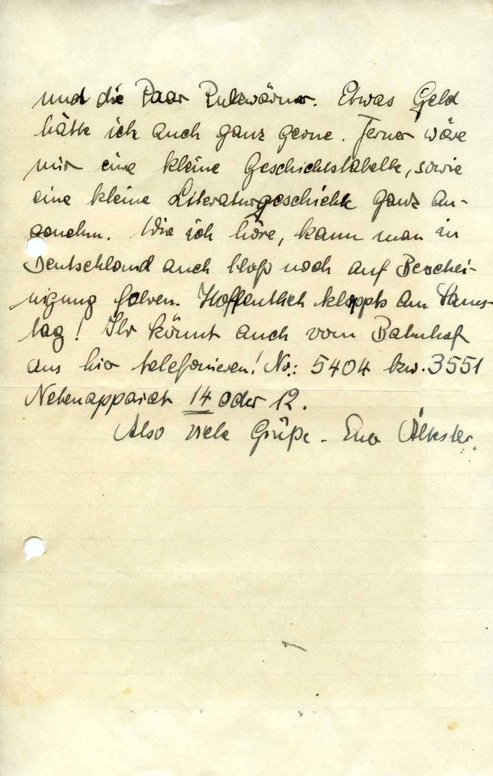 und die Paar Pulzwärmer. Etwas Geld hätte ich auch ganz gerne. Ferner wäre mir eine kleine Geschichtstabelle, sowie eine kleine Literaturgeschichte ganz angenehm. Wie ich höre, kann man in Deutschland auch bloß noch auf Bescheinigung fahren. Hoffentlich klappts am Samstag! Ihr könnt auch vom Bahnhof aus hier telefonieren! No.: 5404 bzw. 3551 Nebenapparat 14 oder 12.