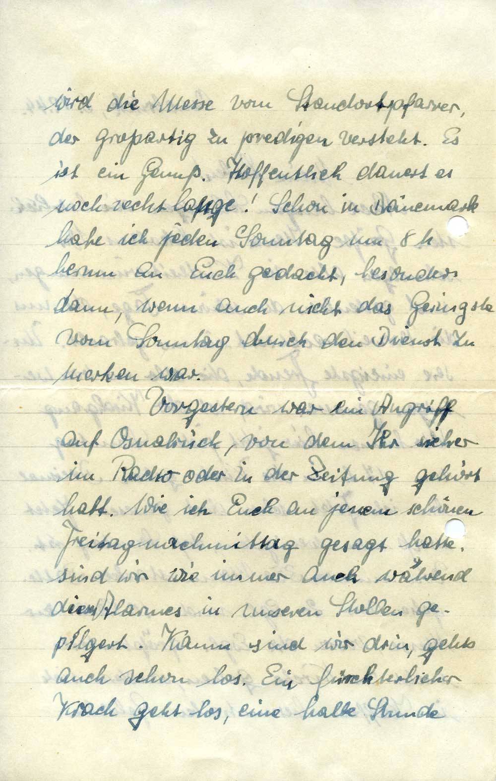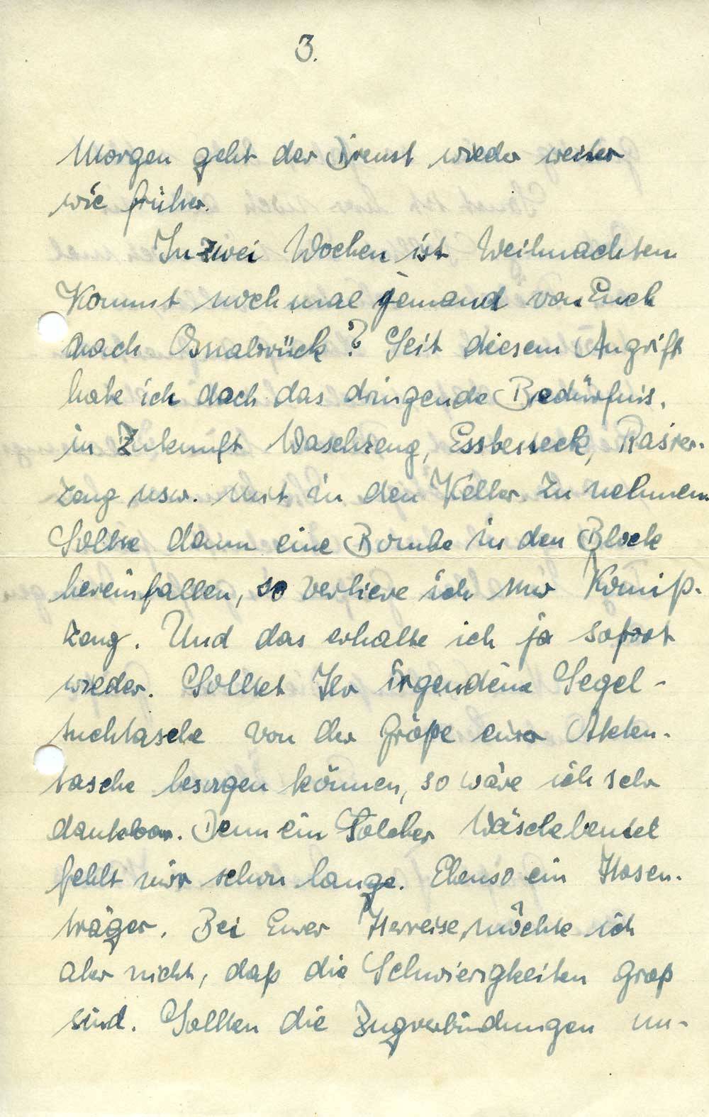 In zwei Wochen ist Weihnachten. Kommt noch mal jemand von Euch nach Osnabrück? Seit diesem Angriff habe ich doch das dringende Bedürfnis, in Zukunft Waschzeug, Essbesteck, Rasierzeug usw. mit in den Keller zu nehmen. Sollte dann eine Bombe in den Block hereinfallen, so verliere ich nur Komißzeug. Und das erhalte ich ja sofort wieder. Solltet Ihr irgendeine Segeltuchtasche von der Größe einer Aktentasche besorgen können, so wäre ich sehr dankbar. Denn ein solcher Wäschebeutel fehlt mir schon lange. Ebenso ein Hosenträger. Bei Eurer Herreise möchte ich aber nicht, daß die Schwierigkeiten groß sind. Sollten die Zugverbindungen un-