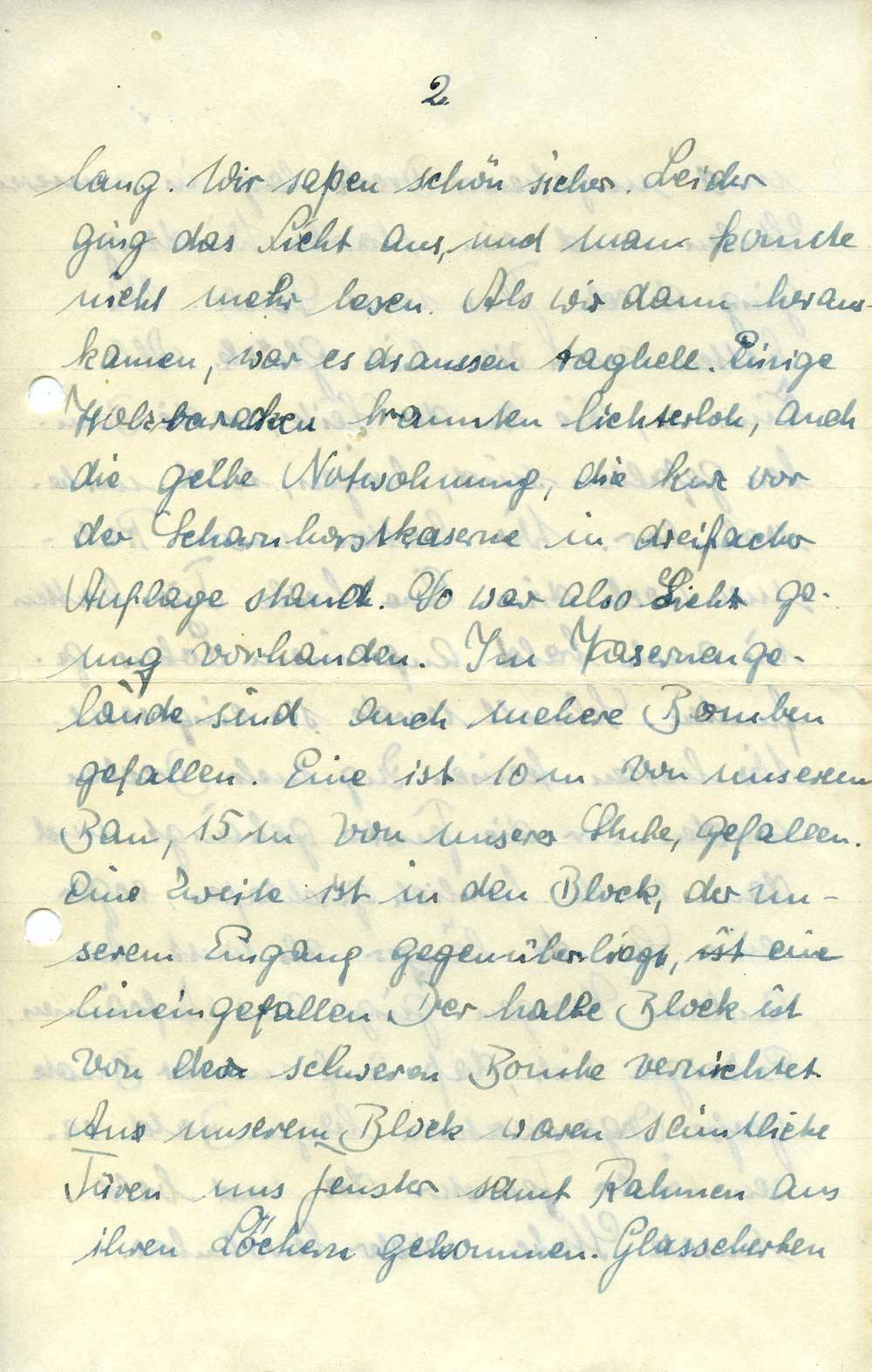 lang. Wir saßen schön sicher. Leider ging das Licht aus, und man konnte nicht mehr lesen. Als wir dann herauskamen, war es draussen taghell. Einige Holzbaracken brannten lichterloh, auch die gelbe Notwohnung, die kurz vor der Scharnhorstkaserne in dreifacher Auflage stand. So war also Licht genug vorhanden. Im Kasernengebäude sind auch mehrere Bomben gefallen. Eine ist 10 m von unserem Bau, 15 m von unserer Stube, gefallen. Eine Zweite ist in den Block, der unserem Eingang gegenüberliegt, hineingefallen. Der halbe Block ist von der schweren Bombe vernichtet. An unserem Block waren sämtliche Türen und Fenster samt Rahmen aus ihren Löchern gekommen. Glasscherben