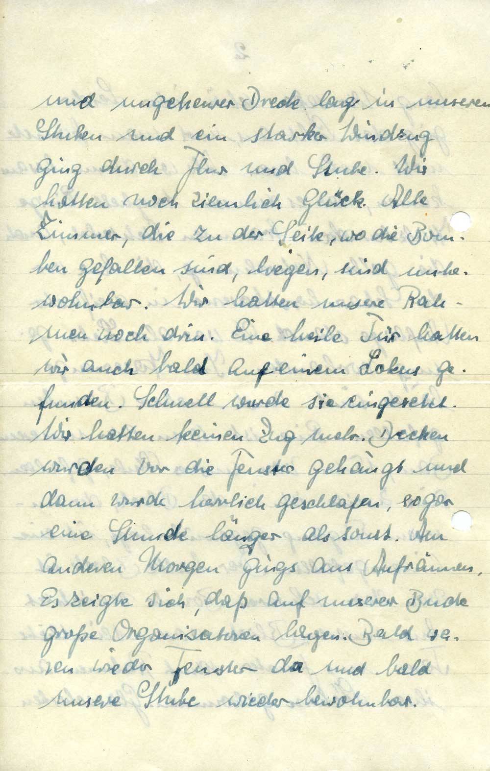 und ungeheurer Dreck lag in unseren Stuben und ein starker Windzug ging durch Flur und Stube. Wir hatten noch ziemlich Glück. Alle Zimmer, die zu der Seite, wo die Bomben gefallen sind, liegen, sind unbewohnbar. Wir hatten unsere Rahmen noch drin. Eine heile Tür hatten wir auch bald auf einem Lokus gefunden. Schnell wurde sie eingesetzt. Wir hatten keinen Zug mehr. Decken wurden vor die Fenster gehängt und dann wurde herrlich geschlafen, sogar eine Stunde länger als sonst. Am anderen Morgen gings ans Aufräumen. Es zeigte sich, daß auf unserer Bude große Organisatoren lagen. Bald waren wieder Fenster da und bald unsere Stube wieder bewohnbar.