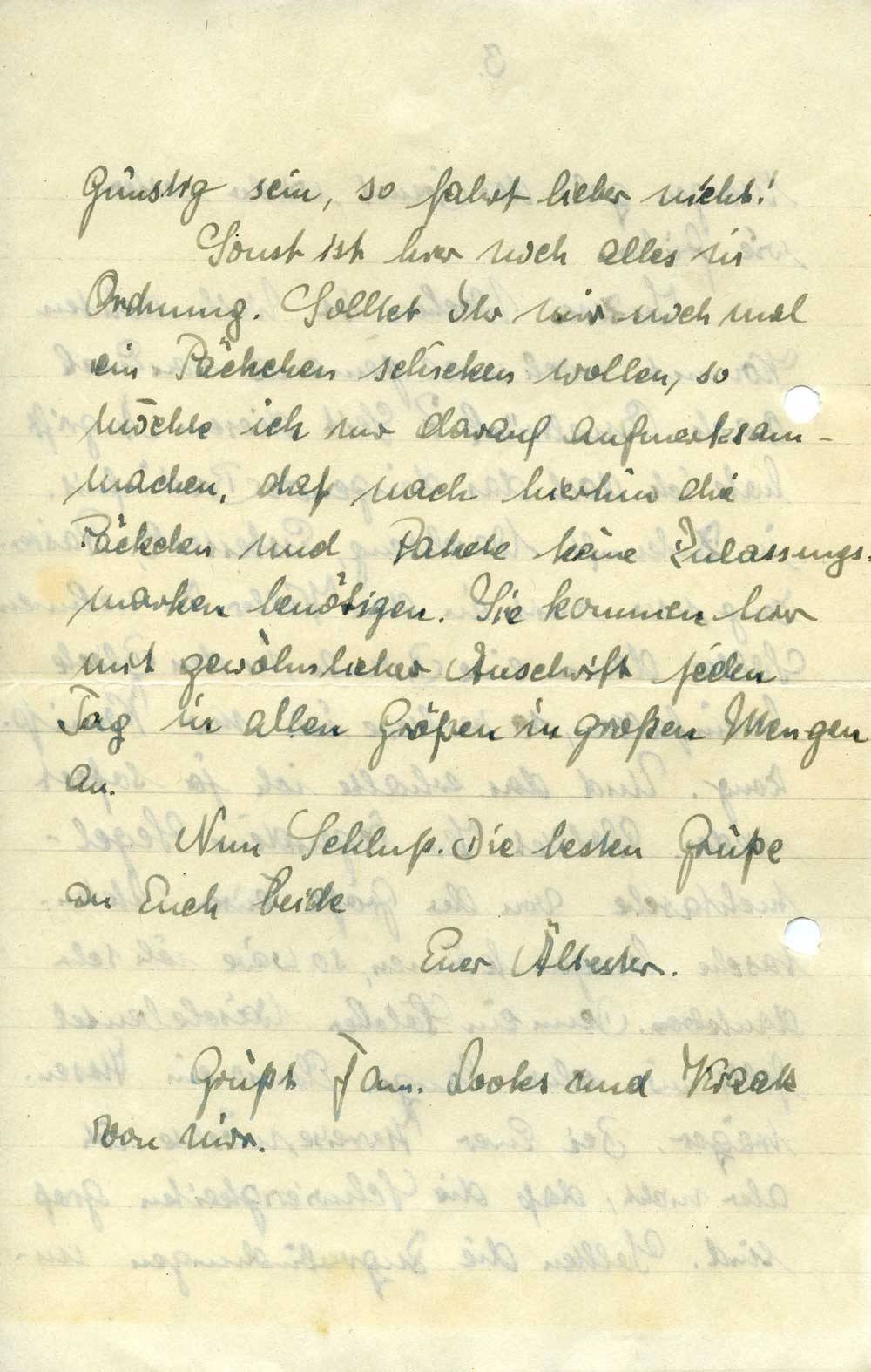 Sonst ist hier noch alles in Ordnung. Solltet Ihr mir noch mal ein Päckchen schicken wollen, so möchte ich nur darauf aufmerksam machen, daß nach hierhin die Päckchen und Pakete keine Zulassungsmarken benötigen. Sie kommen hier mit gewöhnlicher Anschrift jeden Tag in allen Größen in großen Mengen an.
