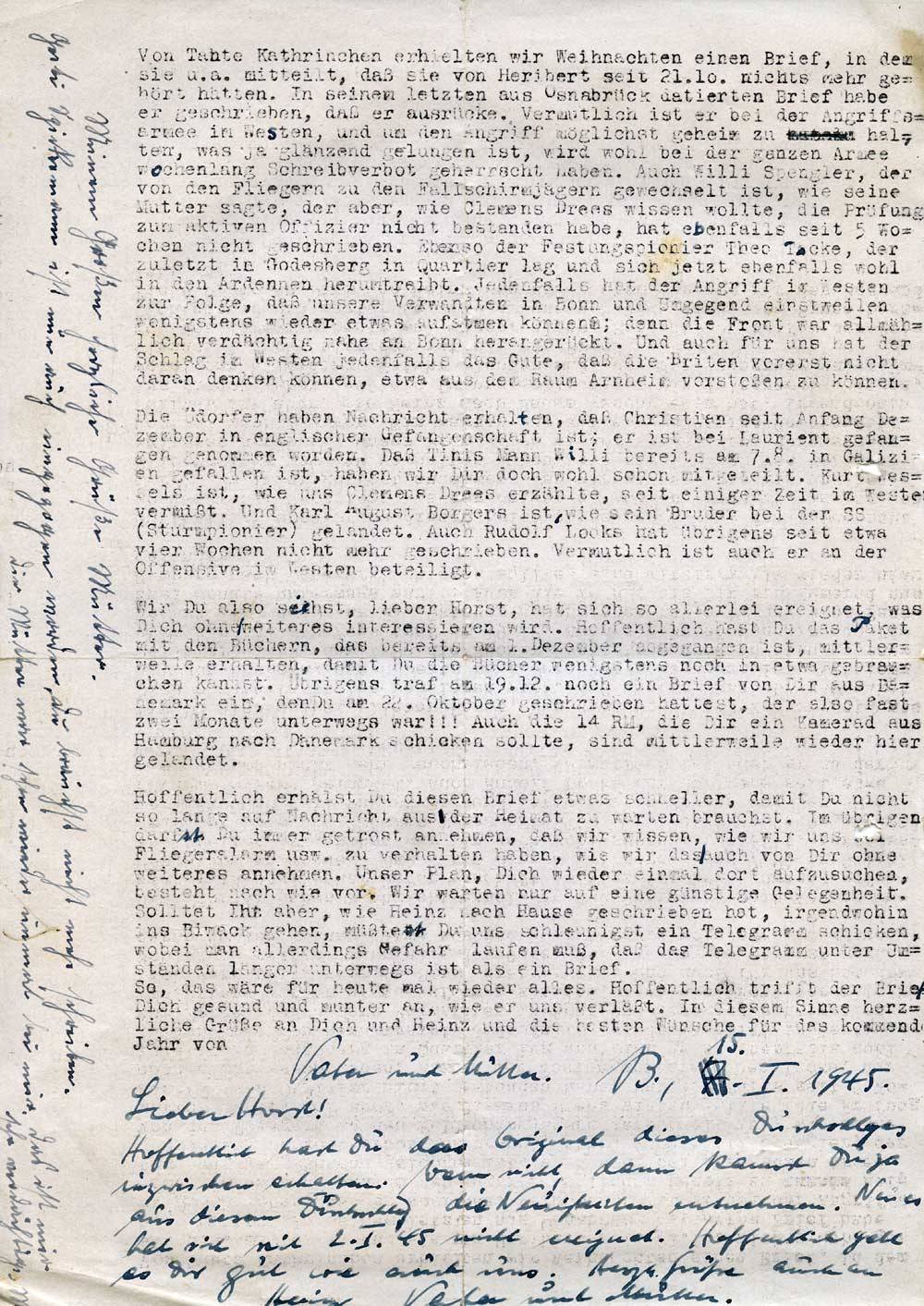 Von Tante Kathrinchen erhielten wir Weihnachten einen Brief, in dem sie u. a. mitteilt, daß sie von Heribert seit 21.10. nichts mehr gehört hätten. In seinem letzten aus Osnabrück datierten Brief habe er geschrieben, daß er ausrücke. Vermutlich ist er bei der Angriffsarmee im Westen, und um den Angriff möglichst geheim zu halten, was ja glänzend gelungen ist, wird wohl bei der ganzen Armee wochenlang Schreibverbot geherrscht haben. Auch Willi Spengler, der von den Fliegern zu den Fallschirmjägern gewechselt ist, wie seine Mutter sagte, der aber, wie Clemens Drees wissen wollte, die Prüfung zum aktiven Offizier nicht bestanden habe, hat ebenfalls seit 5 Wochen nicht geschrieben. Ebenso der Festungspionier Theo Tacke, der zuletzt in Godesberg in Quartier lag und sich jetzt ebenfalls wohl in den Ardennen herumtreibt. Jedenfalls hat der Angriff im Westen zur Folge, daß unsere Verwandten in Bonn und Umgegend einstweilen wenigstens wieder etwas aufatmen können; denn die Front war allmählich verdächtig nahe an Bonn herangerückt. Und auch für uns hat der Schlag im Westen jedenfalls das Gute, daß die Briten vorerst nicht daran denken können, etwa aus dem Raum Arnheim vorstoßen zu können.