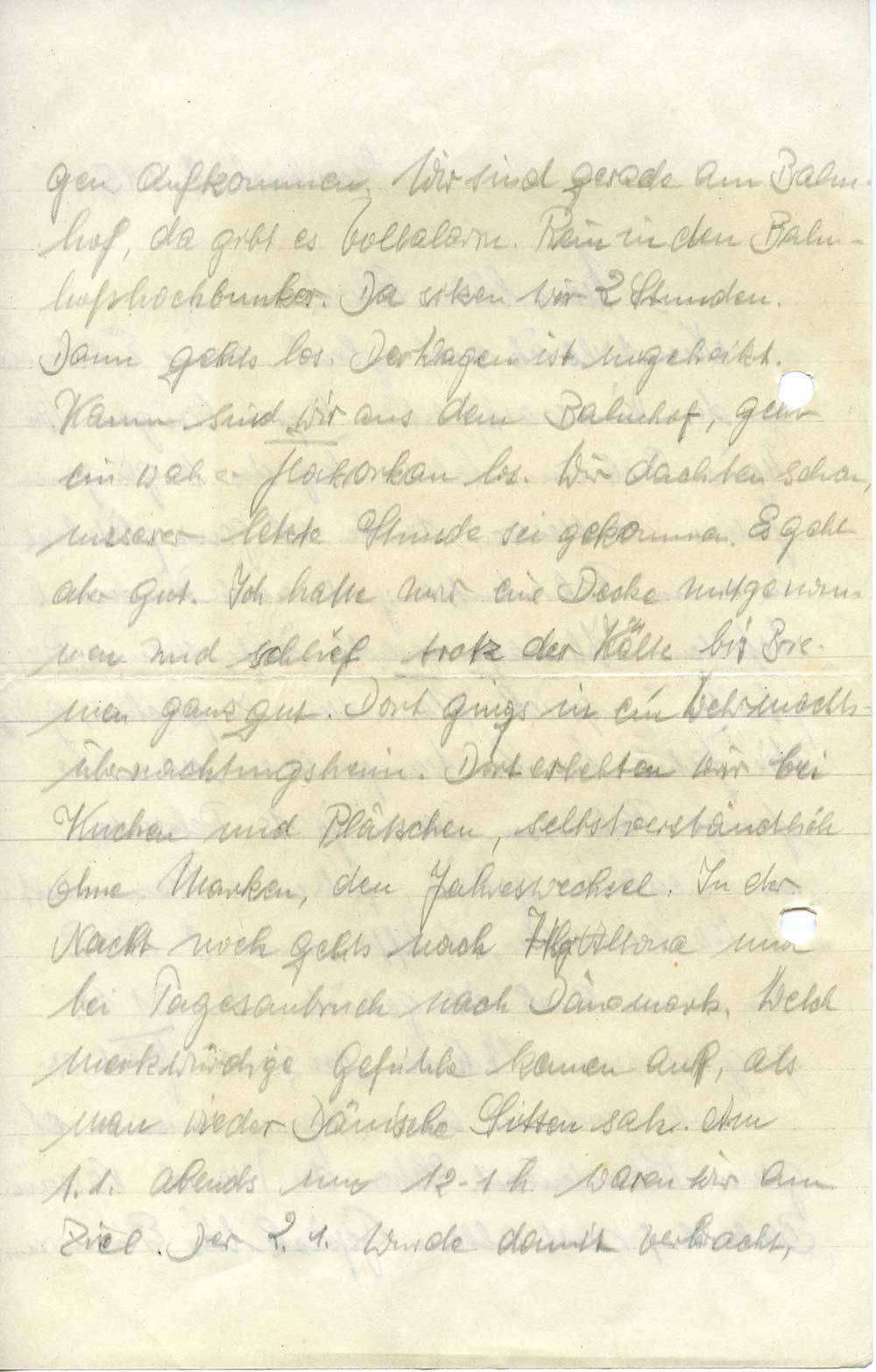 gen aufkommen. Wir sind gerade am Bahnhof, da gibt es Vollalarm. Rein in den Bahnhofshochbunker. Da sitzen wir 2 Stunden. Dann gehts los. Der Wagen ist ungeheizt. Kaum sind wir aus dem Bahnhof, geht ein wahrer Flakorkan los. Wir dachten schon, unsere letzte Stunde sei gekommen. Es geht aber gut. Ich hatte mir eine Decke mitgenommen und schlief trotz der Kälte bis Bremen ganz gut. Dort gings in ein Wehrmachtsübernachtungsheim. Dort erlebten wir bei Kuchen und Plätzchen, selbstverständlich ohne Marken, den Jahreswechsel. In der Nacht noch gehts nach Hbg.-Altona und bei Tagesanbruch nach Dänemark. Welch merkwürdige Gefühle kamen auf, als man wieder Dänische Sitten sah. Am 1.1. abends um 12-1 h waren wir am Ziel. Der 2.1. wurde damit verbracht,