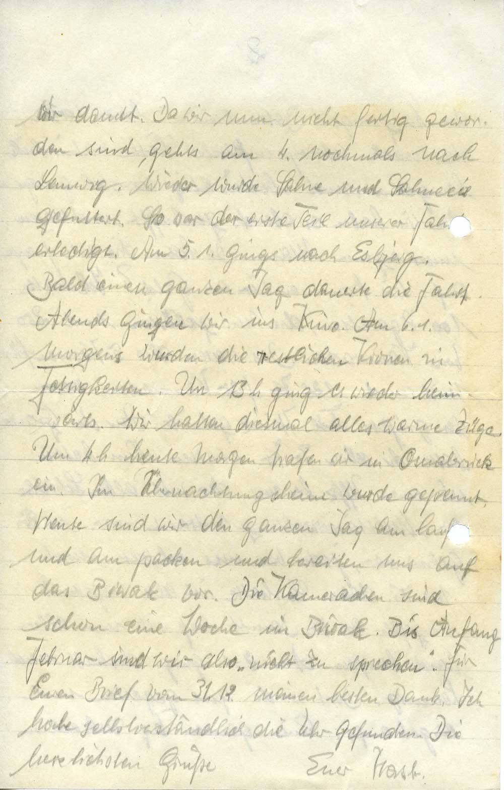 wir damit. Da wir nun nicht fertig geworden sind, gehts am 4. nochmals nach Lemvig. Wieder wurde Sahne und Sahneeis gefuttert. So war der erste Teil unserer Fahrt erledigt. Am 5.1. gings nach Esbjerg. Bald einen ganzen Tag dauerte die Fahrt: Abends gingen wir ins Kino. Am 6.1. morgens wurden die restlichen Kronen in Fettigkeiten. Um 13 h ging es wieder heimwärts. Wir hatten diesmal alles warme Züge. Um 4 h heute morgen trafen wir in Osnabrück ein. Im Übernachtungsheim wurde gepennt. Heute sind wir den ganzen Tag am laufen und am packen und bereiten uns auf das Biwak vor. Die Kameraden sind schon eine Woche im Biwak. Bis Anfang Februar sind wir also „nicht zu sprechen“. Für Euren Brief vom 31.12. meinen besten Dank. Ich habe selbstverständlich die Uhr gefunden. Die herzlichsten Grüße