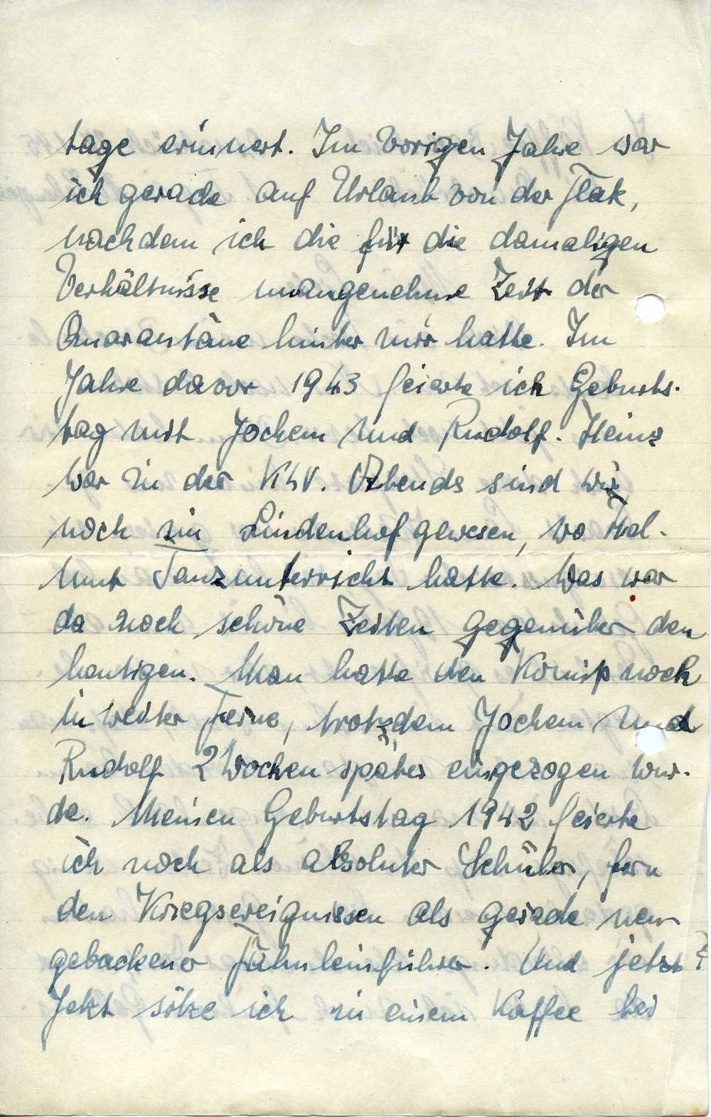 tage erinnert. Im vorigen Jahre war ich gerade auf Urlaub von der Flak, nachdem ich die für die damaligen Verhältnisse unangenehme Zeit der Quarantäne hinter mir hatte. Im Jahre davor 1943 feierte ich Geburtstag mit Jochem und Rudolf. Heinz war in der KLV. Abends sind wir noch im Lindenhof gewesen, wo Helmut Tanzunterricht hatte. Was war da noch schöne Zeiten gegenüber den heutigen. Man hatte den Komiß noch in weiter Ferne, trotzdem Jochem und Rudolf 2 Wochen später eingezogen wurde. Meinen Geburtstag 1942 feierte ich noch als absoluter Schüler, fern den Kriegsereignissen als gerade neu gebackener Fähnleinführer. Und jetzt? Jetzt sitze ich in einem Kaffee bei