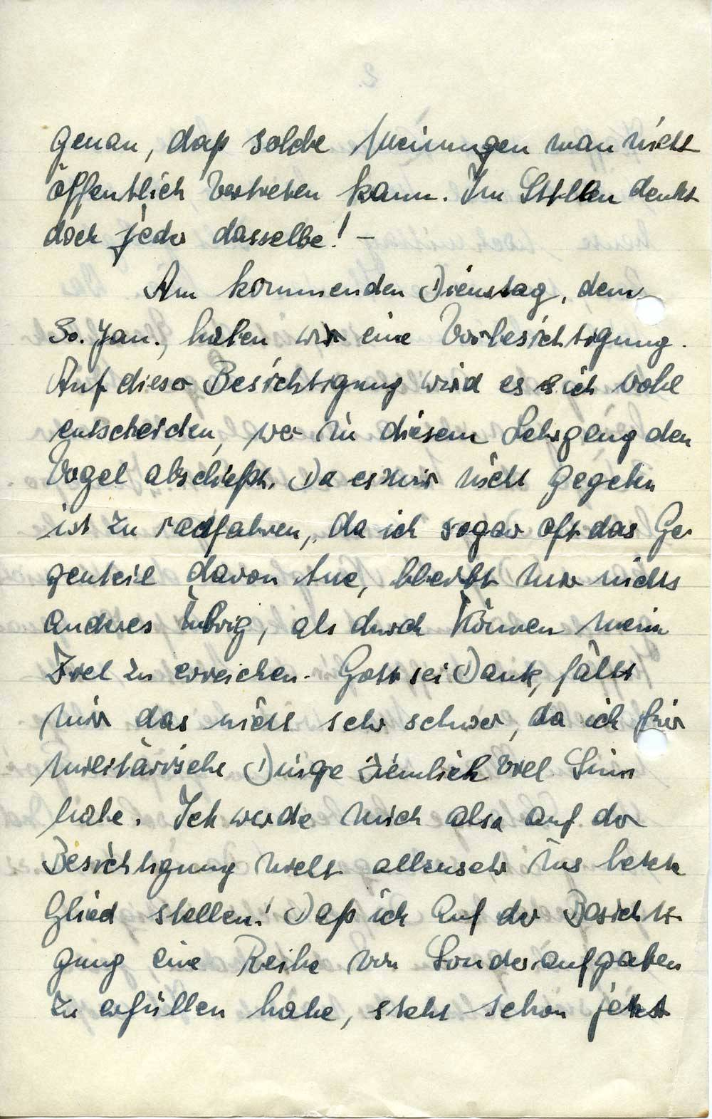 Am kommenden Dienstag, dem 30. Jan., haben wir eine Vorbesichtigung. Auf dieser Besichtigung wird es sich wohl entscheiden, wer in diesem Lehrgang den Vogel abschießt. Da es mir nicht gegeben ist zu radfahren, da ich sogar oft das Gegenteil davon tue, bleibt mir nichts anderes übrig, als durch Können mein Ziel zu erreichen. Gott sei Dank fällt mir das nicht sehr schwer, da ich für militärische Dinge ziemlich viel Sinn habe. Ich werde mich also auf der Besichtigung nicht allzusehr ins letzte Glied stellen! Daß ich auf der Besichtigung eine Reihe von Sonderaufgaben zu erfüllen habe, steht schon jetzt