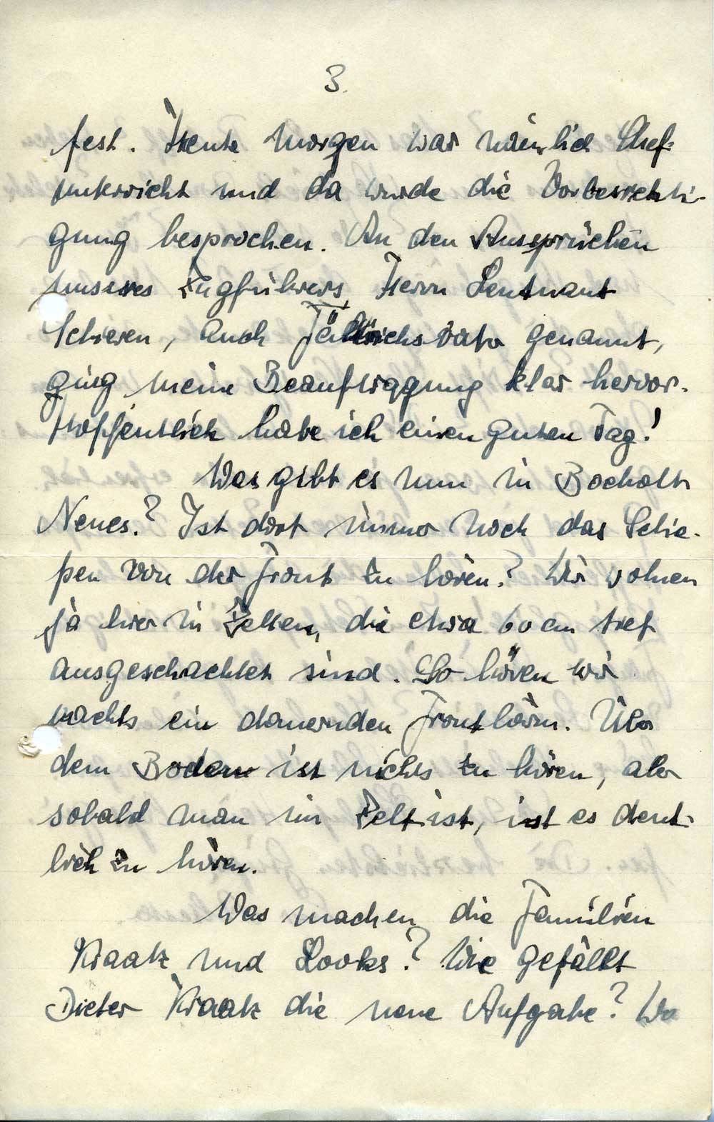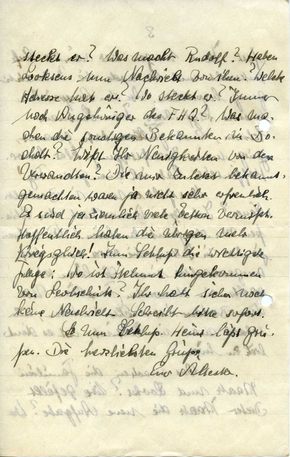 steckt er? Was macht Rudolf? Haben Looksens nun Nachricht von ihm? Welche Adresse hat er? Wo steckt er? Immer noch Angehöriger des FHQ? Was machen die sonstigen Bekannten in Bocholt? Wißt Ihr Neuigkeiten von den Verwandten? Die mir zuletzt bekanntgemachten waren ja nicht sehr erfreulich. Es sind ja ziemlich viele Vettern vermißt. Hoffentlich haben die übrigen mehr Kriegsglück! Zum Schluß die wichtigste Frage: Wo ist Helmut hingekommen von Leobschütz? Ihr habt sicher noch keine Nachricht. Schreibt mir sofort.