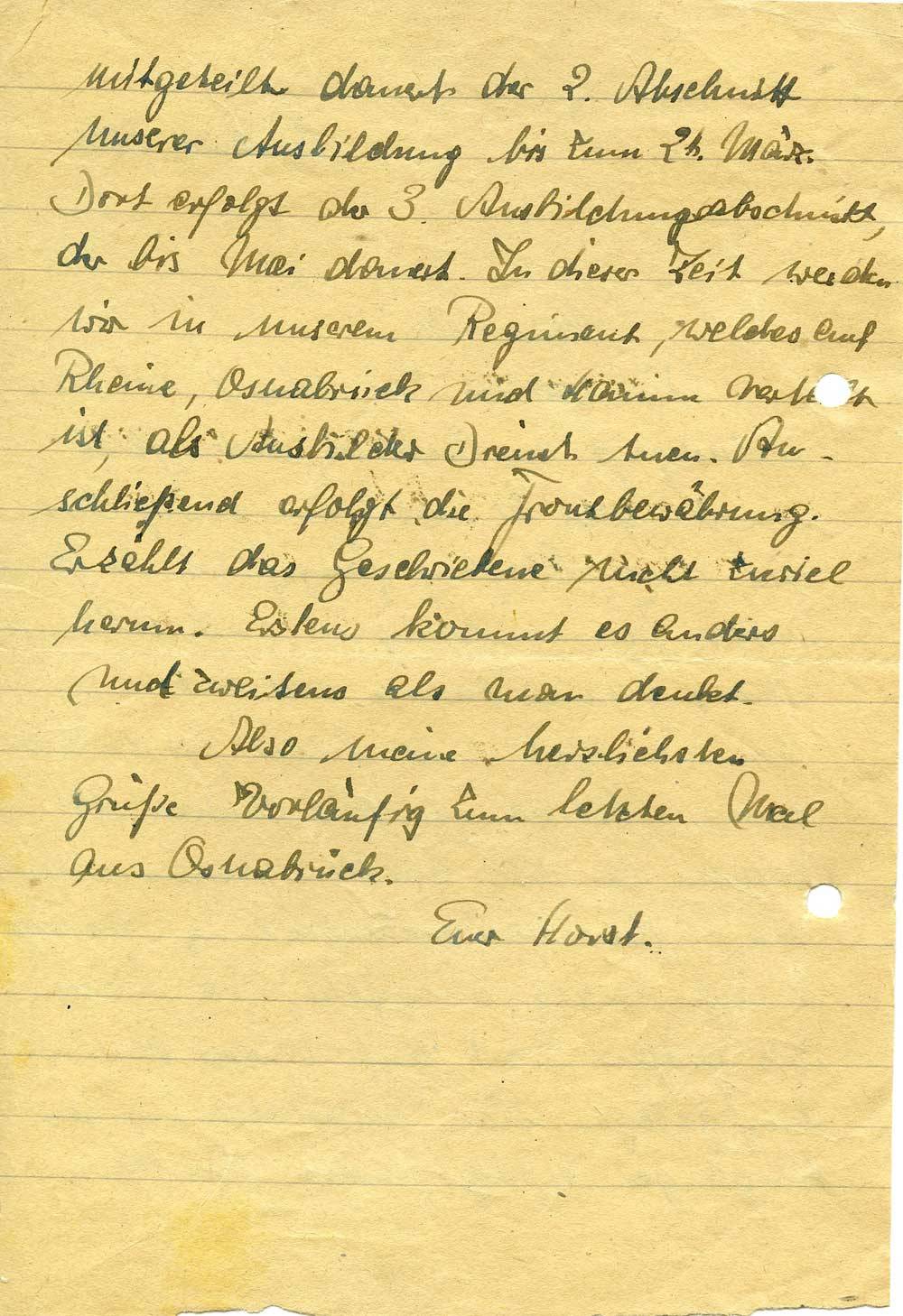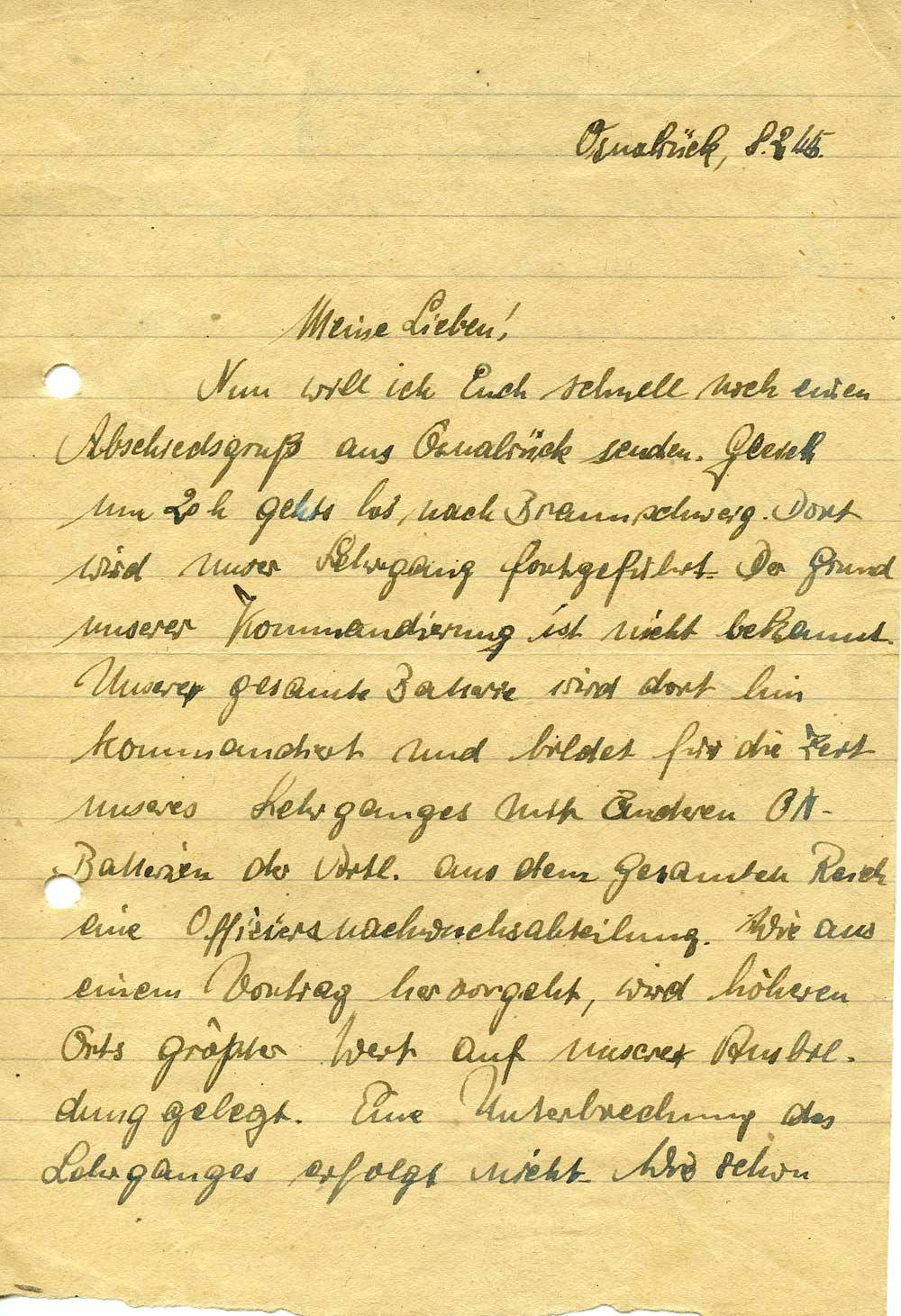 Nun will ich Euch schnell noch einen Abschiedsgruß aus Osnabrück senden. Gleich um 20 h gehts los, nach Braunschweig. Dort wird unser Lehrgang fortgeführt. Der Grund unserer Kommandierung ist nicht bekannt. Unsere gesamte Batterie wird dort hin kommandiert und bildet für die Zeit unseres Lehrganges mit anderen ON-Batterien der Artl. aus dem gesamten Reich eine Offiziersnachwuchsabteilung. Wie aus einem Vortrag hervorgeht, wird höheren Orts größter Wert auf unsere Ausbildung gelegt. Eine Unterbrechung des Lehrganges erfolgt nicht. Wie schon