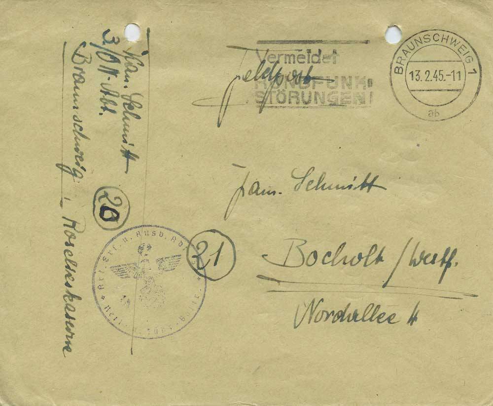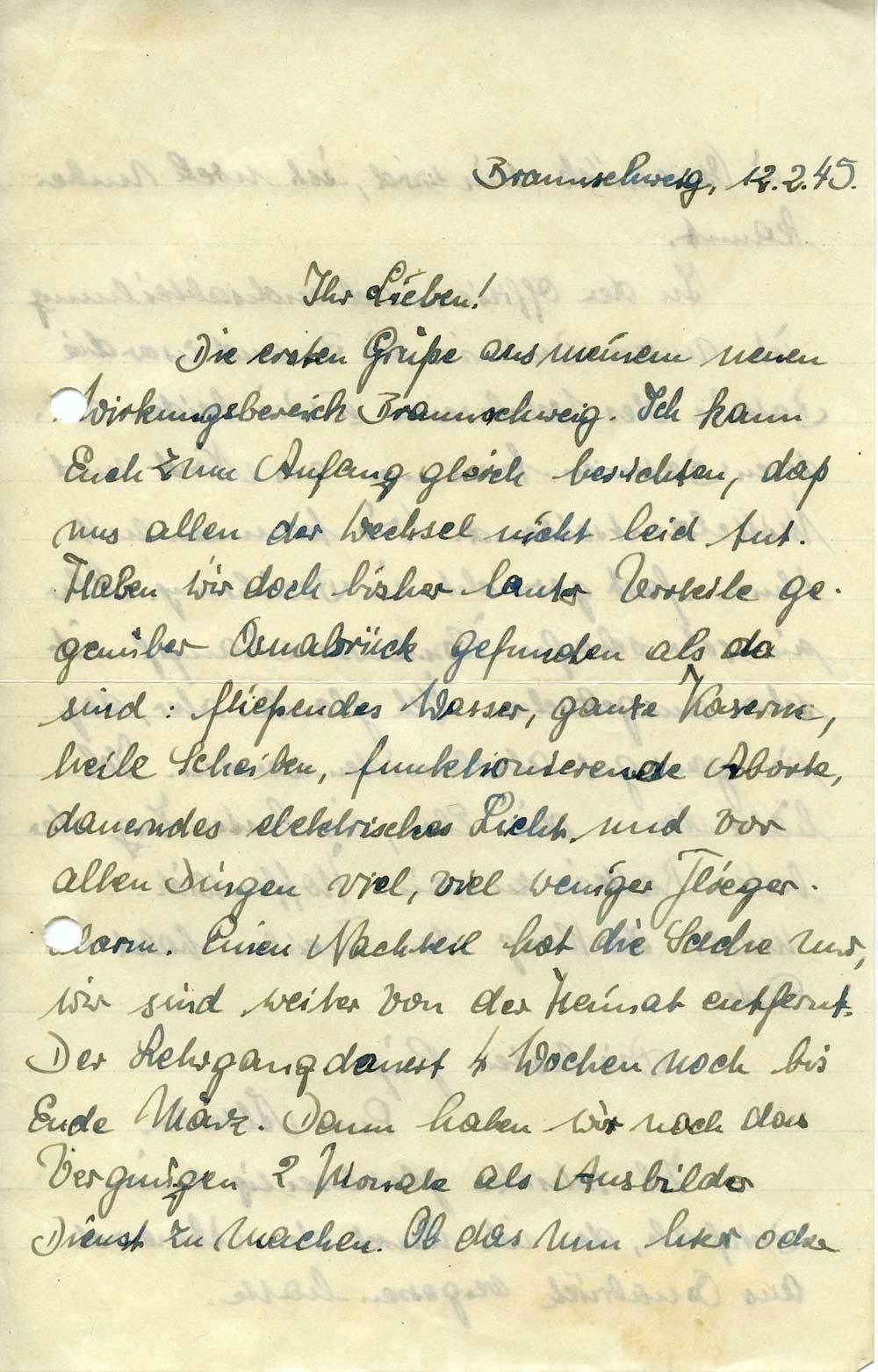 Die ersten Grüße aus meinem neuen Wirkungsbereich Braunschweig. Ich kann Euch zum Anfang gleich berichten, daß uns allen der Wechsel nicht leid tut. Haben wir doch bisher lauter Vorteile gegenüber Osnabrück gefunden als da sind: fließendes Wasser, ganze Kaserne, heile Scheiben, funktionierende Aborte, dauerndes elektrisches Licht und vor allen Dingen viel, viel weniger Fliegeralarm. Einen Nachteil hat die Sache nur, wir sind weiter von der Heimat entfernt. Der Lehrgang dauert 4 Wochen noch bis Ende März. Dann haben wir noch das Vergnügen 2 Monate als Ausbilder Dienst zu machen. Ob das nun hier oder