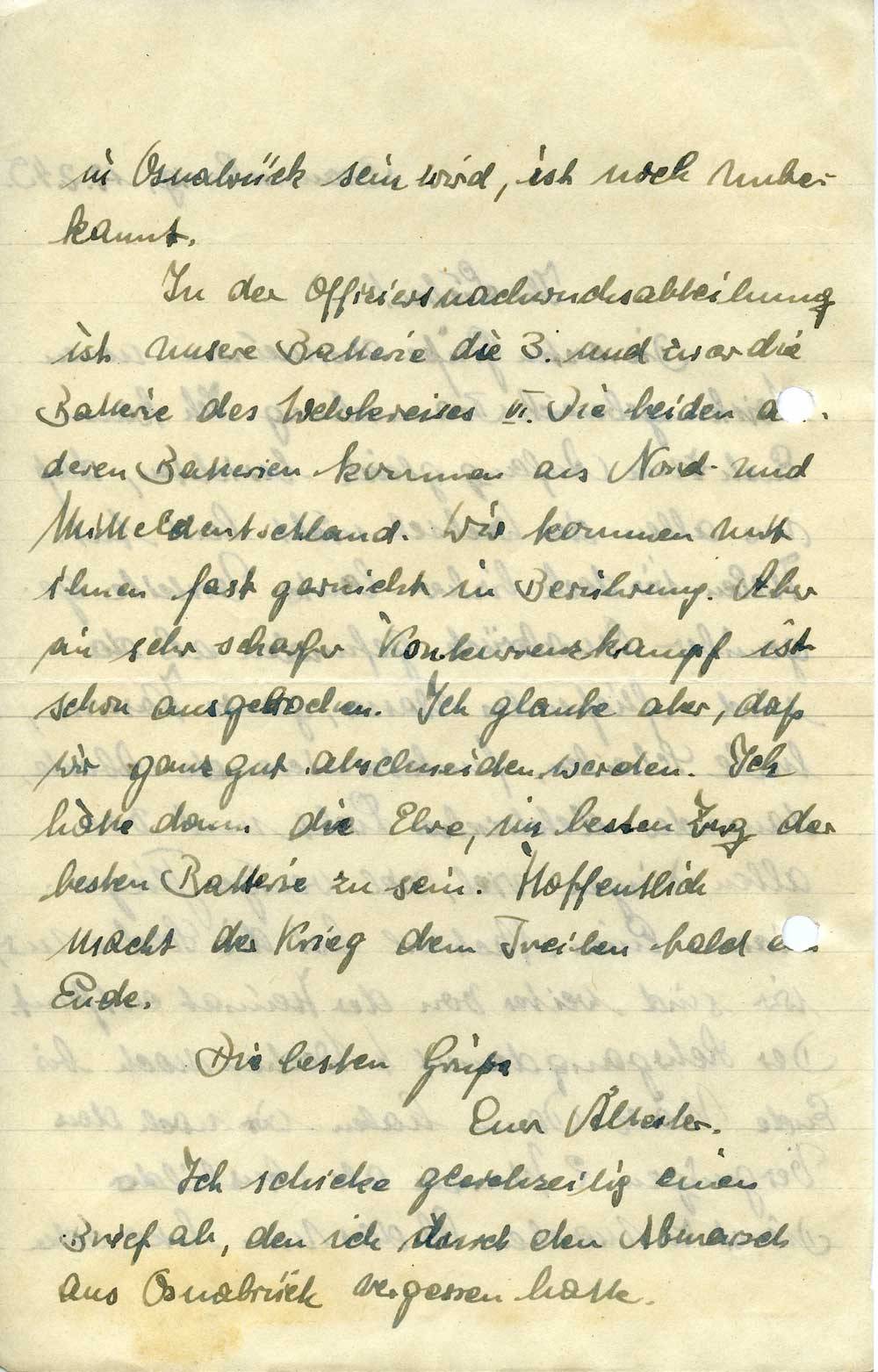 In der Offiziersnachwuchsabteilung ist unsere Batterie die 3. und zwar die Batterie des Wehrkreises VI. Die beiden anderen Batterien kommen aus Nord- und Mitteldeutschland. Wir kommen mit ihnen fast garnicht in Berührung. Aber ein sehr scharfer Konkurrenzkampf ist schon ausgebrochen. Ich glaube aber, daß wir ganz gut abschneiden werden. Ich hätte dann die Ehre, im besten Zug der besten Batterie zu sein. Hoffentlich macht der Krieg dem Treiben bald ein Ende.