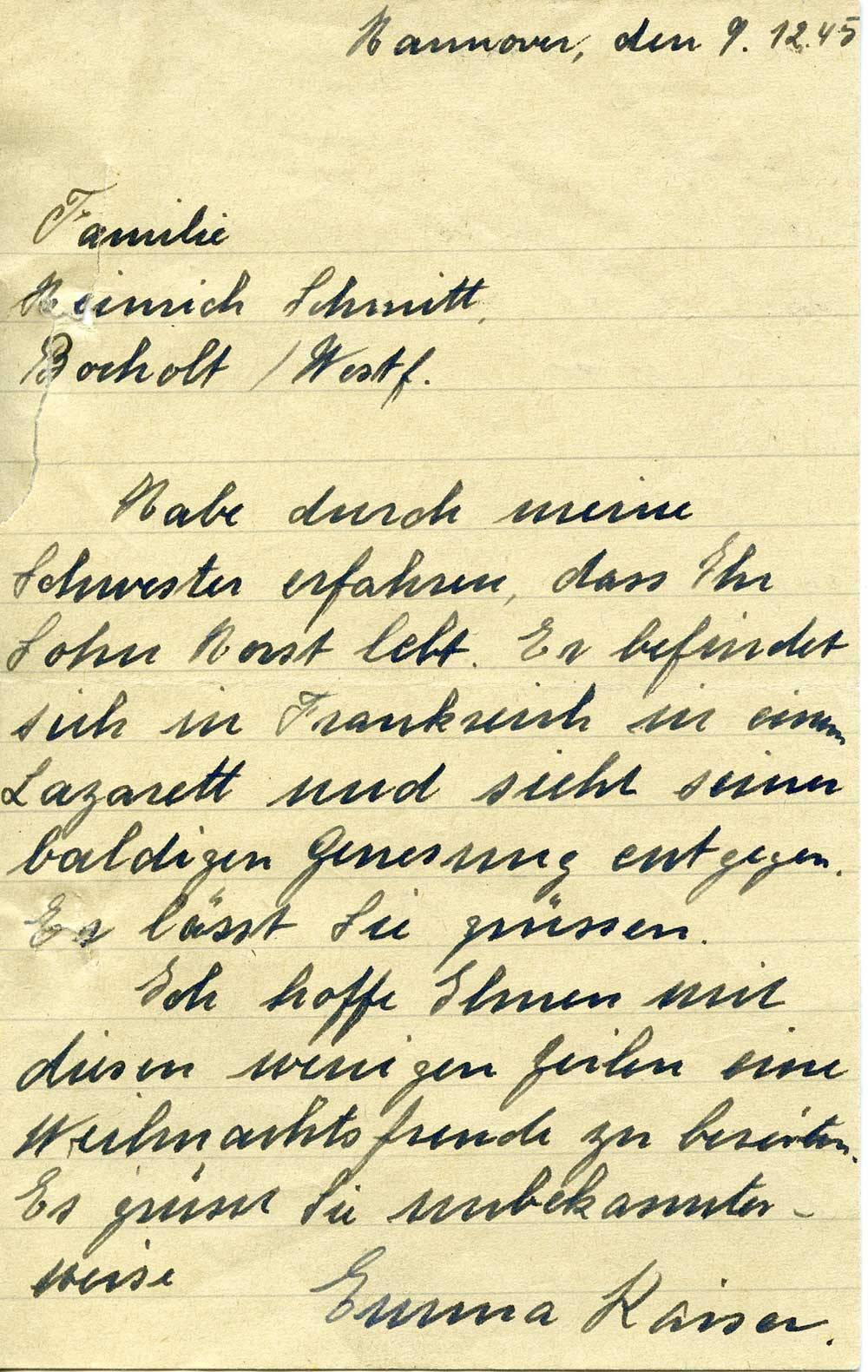 Habe durch meine Schwester erfahren, dass Ihr Sohn Horst lebt. Er befindet sich in Frankreich in einem Lazarett und sieht seiner baldigen Genesung entgegen. Er lässt Sie grüssen.