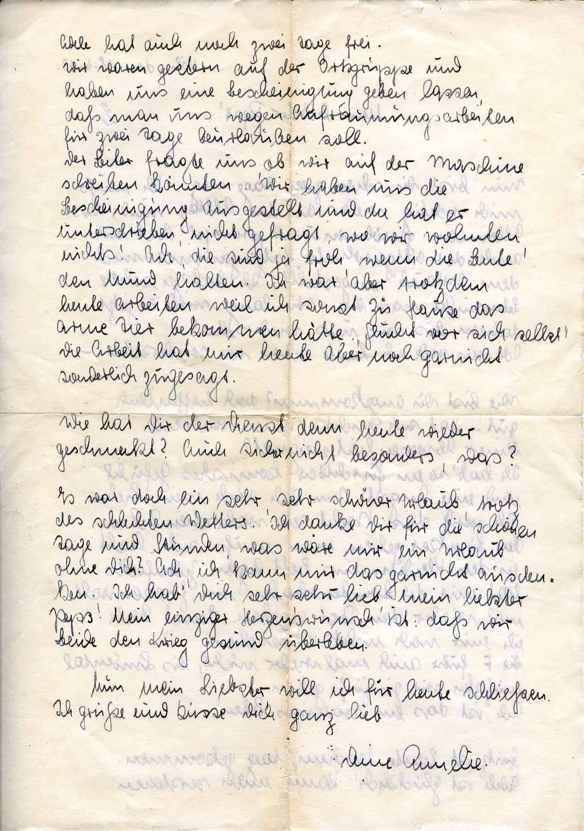 Es war doch ein sehr, sehr schöner Urlaub, trotz des schlechten Wetters. Ich danke Dir für die schönen Tage und Stunden, was wäre mir ein Urlaub ohne Dich? Ach, ich kann mir das garnicht ausdenken. Ich hab’ Dich sehr sehr lieb, mein liebster Peps! Mein einziger Herzenswunsch ist: daß wir Beide den Krieg gesund überleben.