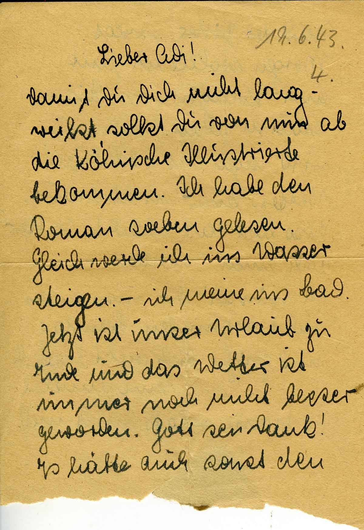 Damit Du Dich nicht langweilst, sollst Du von nun ab die Kölnische Illustrierte bekommen. Ich habe den Roman soeben gelesen. Gleich werde ich ins Wasser steigen. - ich meine ins Bad.