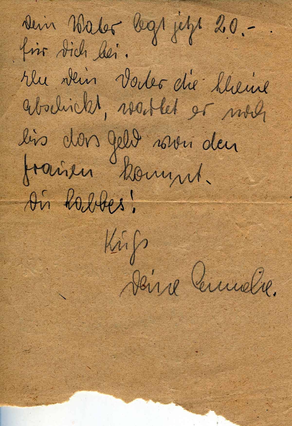 Dein Vater wird das Gewünschte an die 2 Soldaten abschicken. Bitte in Zukunft nichts mehr für Kameraden besorgen. Das geht nicht! Sonst muß ich es Dir abziehen!