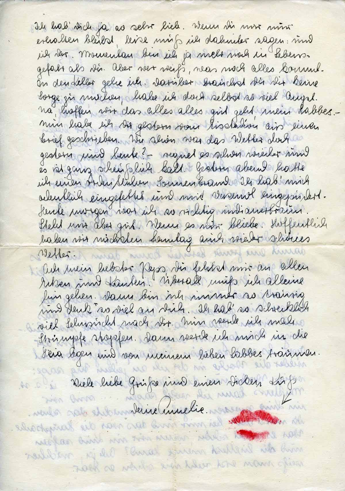 Ich hab’ Dich ja so sehr lieb. Wenn Du mir nur erhalten bleibst, leise muß ich dahinter sagen: und ich Dir. Momentan bin ich ja mehr noch in Lebensgefahr als Du. Aber wer weiß, was noch alles kommt. In den Keller gehe ich. Darüber brauchst Du Dir keine Sorge zu machen, habe ich doch selbst so viel Angst. Na, hoffen wir das alles alles gut geht, mein Labbes. - Nun habe ich Dir gestern vom Eisstadion aus einen Brief geschrieben. Wie schön war das Wetter doch gestern und heute? - regnet es schon wieder und es ist ganz scheußlich kalt. Gestern abend hatte ich einen ordentlichen Sonnenbrand. Ich hab’ mich ordentlich eingefettet und mit Vasenol eingepudert. Heute morgen war ich so richtig indianerbraun. Steht mir aber gut. Wenn es nur bliebe. Hoffentlich haben wir nächsten Sonntag auch wieder schönes Wetter.