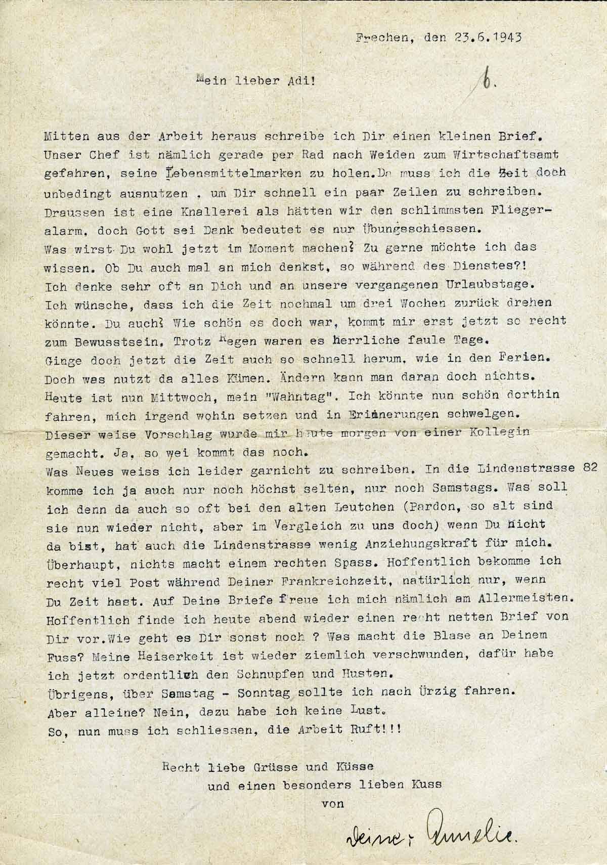 Mitten aus der Arbeit heraus schreibe ich Dir einen kleinen Brief. Unser Chef ist nämlich gerade per Rad nach Weiden zum Wirtschaftsamt gefahren, seine Lebensmittelmarken zu holen. Da muss ich die Zeit doch unbedingt ausnutzen, um Dir schnell ein paar Zeilen zu schreiben. Draussen ist eine Knallerei als hätten wir den schlimmsten Fliegeralarm, doch Gott sei Dank bedeutet es nur Übungsschiessen.