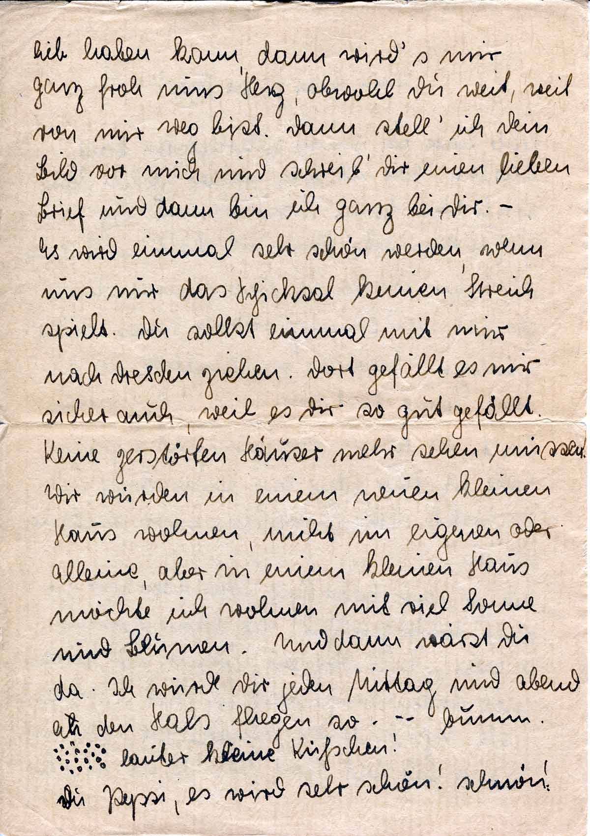Es wird einmal sehr schön werden, wenn uns nur das Schicksal keinen Streich spielt. Du sollst einmal mit mir nach Dresden ziehen. Dort gefällt es mir sicher auch, weil es Dir so gut gefällt. Keine zerstörten Häuser mehr sehen müssen! Wir würden in einem neuen kleinen Haus wohnen, nicht im eigenen oder alleine, aber in einem kleinen Haus möchte ich wohnen mit viel Sonne und Blumen. Und dann wärst Du da. Ich würde Dir jeden Mittag und abend an den Hals fliegen so - - - bumm.