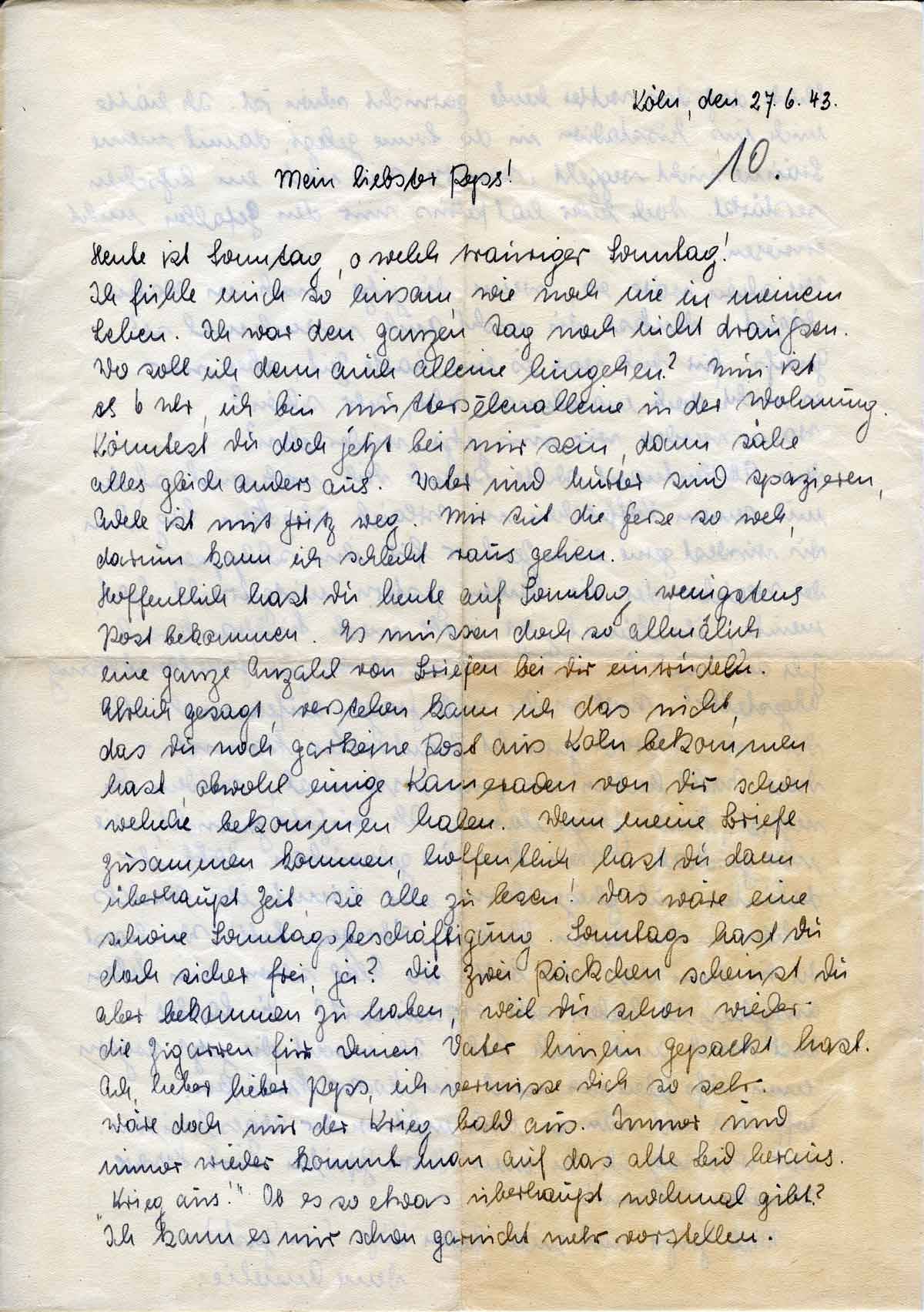 Hoffentlich hast Du heute auf Sonntag wenigstens Post bekommen. Es müssen doch so allmählich eine ganze Anzahl von Briefen bei Dir eintrudeln. Ehrlich gesagt, verstehen kann ich das nicht, das Du noch garkeine Post aus Köln bekommen hast, obwohl einige Kameraden von Dir schon welche bekommen haben. Wenn meine Briefe zusammen kommen, hoffentlich hast Du dann überhaupt Zeit, sie alle zu lesen! Das wäre eine schöne Sonntagsbeschäftigung. Sonntags hast Du doch sicher frei, ja? Die zwei Päckchen scheinst Du aber bekommen zu haben, weil Du schon wieder die Zigarren für Deinen Vater hinein gepackt hast. Ach, lieber lieber Peps, ich vermisse Dich so sehr. Wäre doch nur der Krieg bald aus. Immer und immer wieder kommt man auf das alte Leid heraus. „Krieg aus“. Ob es so etwas überhaupt nochmal gibt? Ich kann es mir schon garnicht mehr vorstellen.