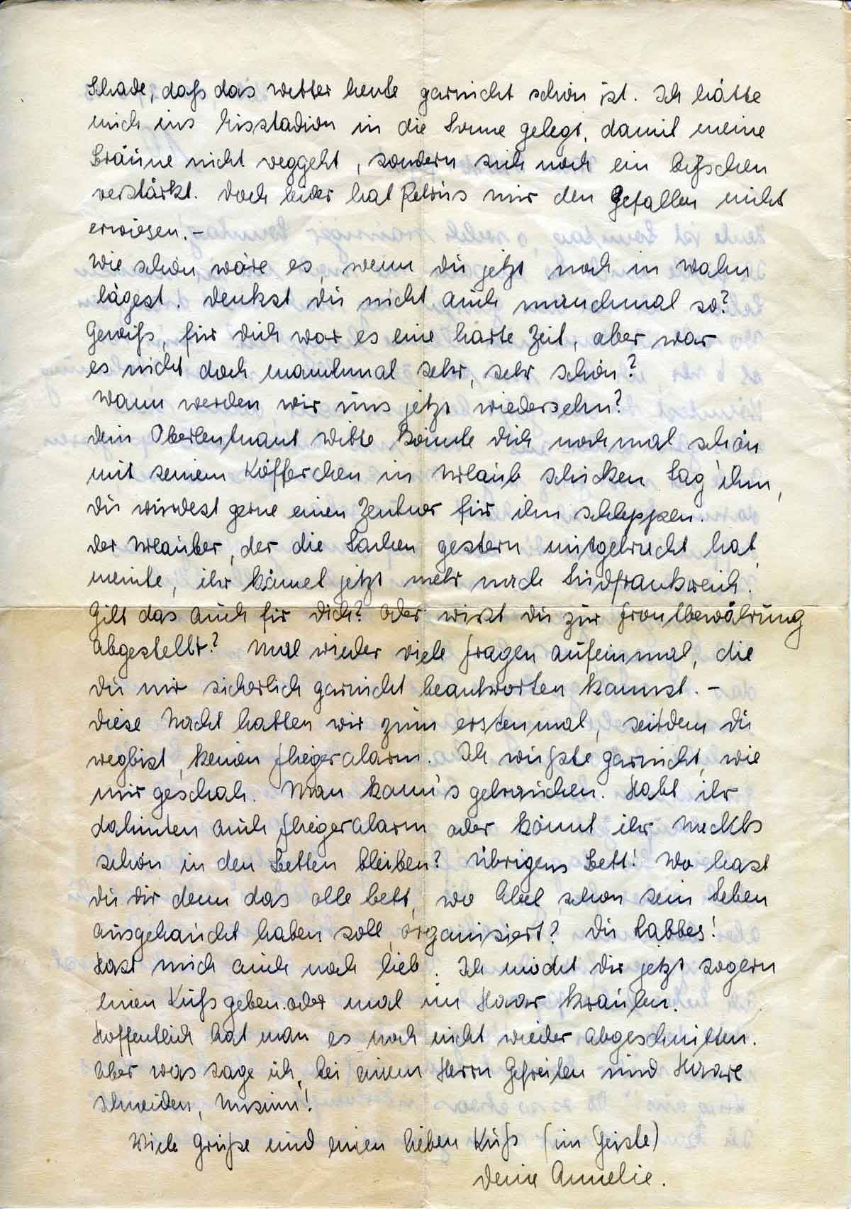 Diese Nacht hatten wir zum erstenmal, seitdem Du wegbist, keinen Fliegeralarm. Ich wußte garnicht, wie mir geschah. Man kann’s gebrauchen. Habt ihr dahinten auch Fliegeralarm oder könnt ihr nachts schön in den Betten bleiben? Übrigens Bett! Wo hast Du Dir denn das olle Bett, wo Abel schon sein Leben ausgehaucht haben soll, organisiert? Du Labbes!