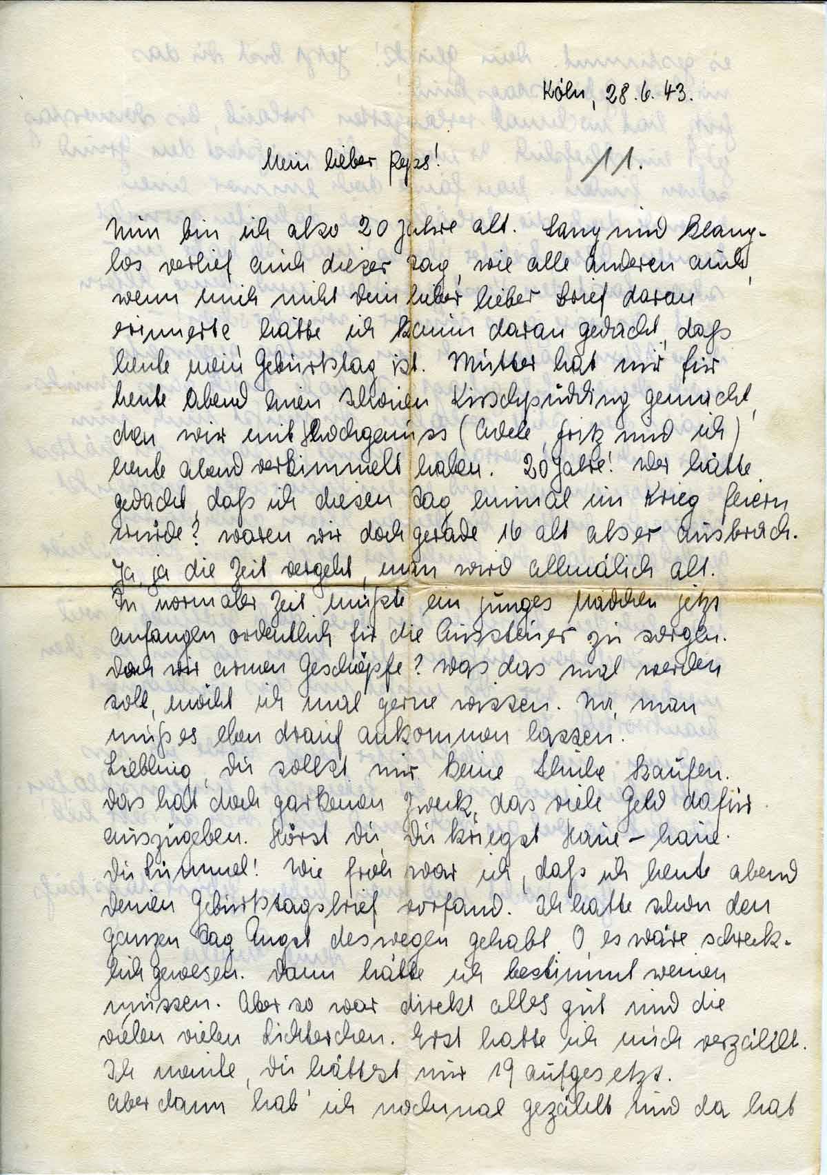 Nun bin ich also 20 Jahre alt. Sang und klanglos verlief auch dieser Tag, wie alle anderen auch, wenn mich nicht Dein lieber lieber Brief daran erinnerte, hätte ich kaum daran gedacht, daß heute mein Geburtstag ist. Mutter hat mir für heute abend einen schönen Kirschpudding gemacht, den wir mit Hochgenuss (Adele, Fritz und ich) heute abend verkimmelt haben. 20 Jahre! Wer hätte gedacht, daß ich diesen Tag einmal im Krieg feiern würde? Waren wir doch gerade 16 alt als er ausbrach. Ja, ja die Zeit vergeht, man wird allmählich alt. In normaler Zeit müßte ein junges Mädchen jetzt anfangen ordentlich für die Aussteuer zu sorgen. Doch wir armen Geschöpfe? Was das mal werden soll, möcht ich mal gerne wissen. Na, man muß es eben drauf ankommen lassen.