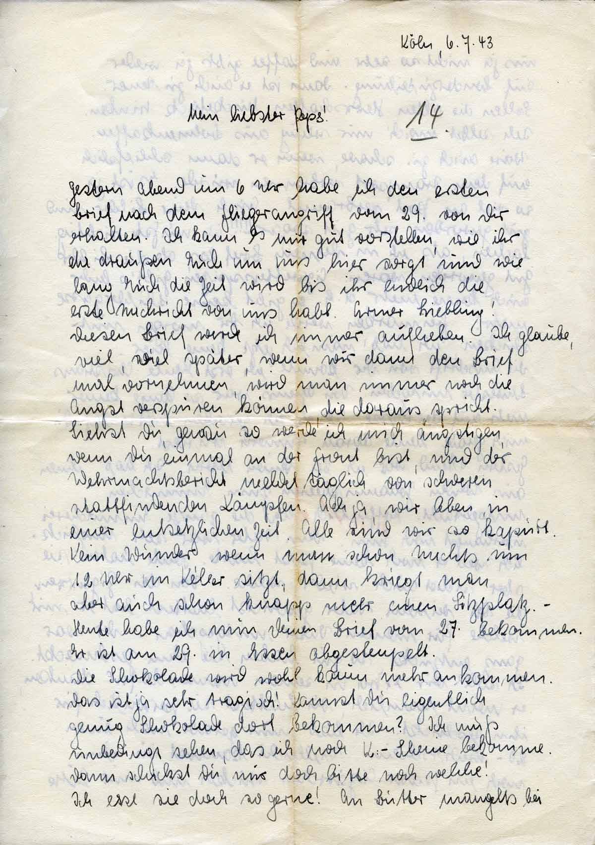 Gestern Abend um 6 Uhr habe ich den ersten Brief nach dem Fliegerangriff vom 29. von Dir erhalten. Ich kann es mir gut vorstellen, wie ihr da draußen Euch um uns hier sorgt und wie lang Euch die Zeit wird bis ihr endlich die erste Nachricht von uns habt. Armer Liebling! Diesen Brief werde ich immer aufheben. Ich glaube, viel, viel später, wenn wir dann den Brief mal vornehmen, wird man immer noch die Angst verspüren können, die daraus spricht. Siehst Du, genau so werde ich mich ängstigen, wenn Du einmal an der Front bist, und der Wehrmachtsbericht meldet täglich von schweren stattfindenden Kämpfen. Ach ja, wir leben in einer entsetzlichen Zeit. Alle sind wir so kaputt. Kein Wunder, wenn man schon Nachts um 12 Uhr im Keller sitzt, dann kriegt man aber auch schon knapp mehr einen Sitzplatz. - Heute habe ich nun Deinen Brief vom 27. bekommen. Er ist am 29. in Essen abgestempelt.
