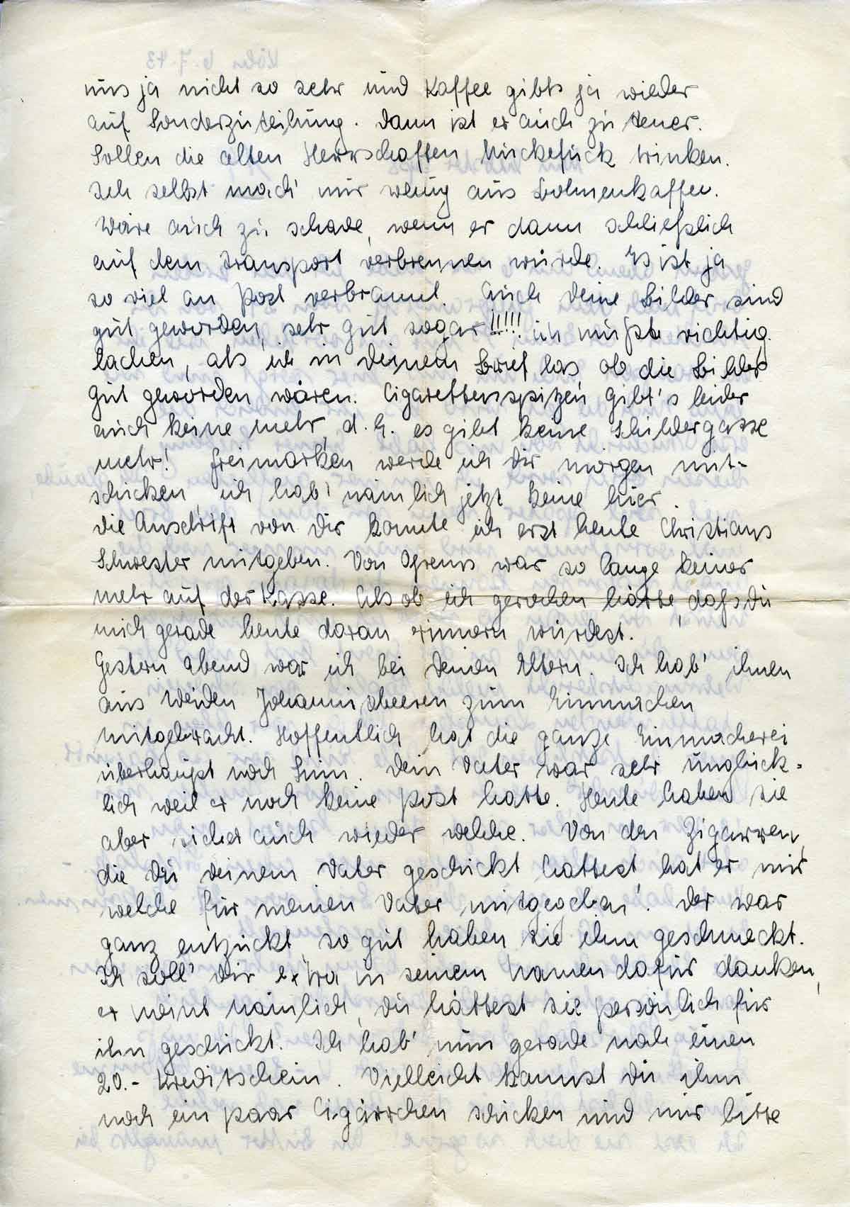uns ja nicht so sehr und Kaffee gibts ja wieder auf Sonderzuteilung. Dann ist er auch zu teuer. Sollen die alten Herrschaften Muckefuck trinken. Ich selbst mach’ mir wenig aus Bohnenkaffee. Wäre auch zu schade, wenn er dann schließlich auf dem Transport verbrennen würde. Es ist ja so viel an Post verbrannt. Auch Deine Bilder sind gut geworden, sehr gut sogar!!!!! Ich mußte richtig lachen, als ich in Deinem Brief las, ob die Bilder gut geworden wären. Cigarettenspitzen gibt’s leider auch keine mehr, d. h. es gibt keine Schildergasse mehr! Freimarken werde ich Dir morgen mitschicken, ich hab’ nämlich jetzt keine hier.