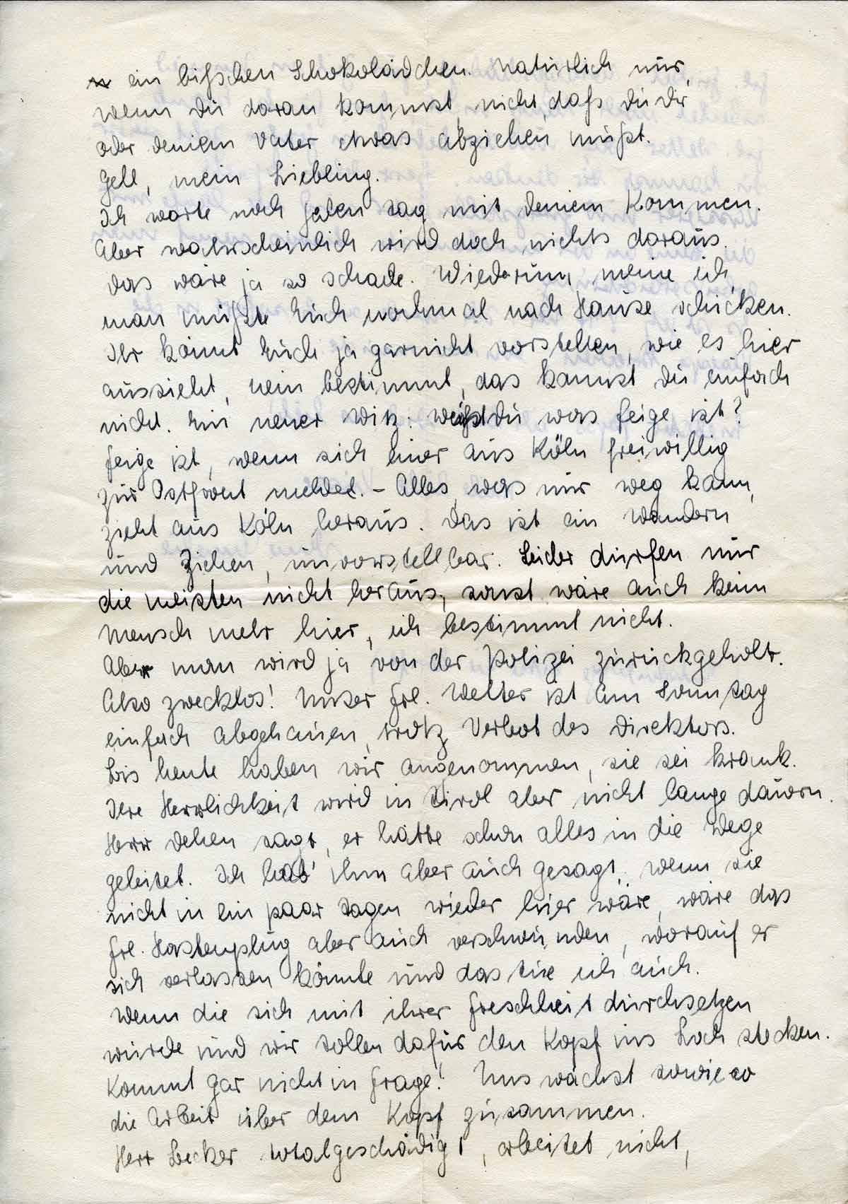Ich warte noch jeden Tag mit Deinem Kommen. Aber wahrscheinlich wird doch nichts daraus. Das wäre ja so schade. Wiederum meine ich, man müßte Euch nochmal nach Hause schicken. Ihr könnt Euch ja garnicht vorstellen, wie es hier aussieht, nein bestimmt, das kannst Du einfach nicht. Ein neuer Witz: Weißt Du was feige ist? Feige ist, wenn sich einer aus Köln freiwillig zur Ostfront meldet. - Alles, was nur weg kann, zieht aus Köln heraus. Das ist ein Wandern und Ziehen, unvorstellbar. Leider dürfen nur die meisten nicht heraus, sonst wäre auch kein Mensch mehr hier, ich bestimmt nicht.