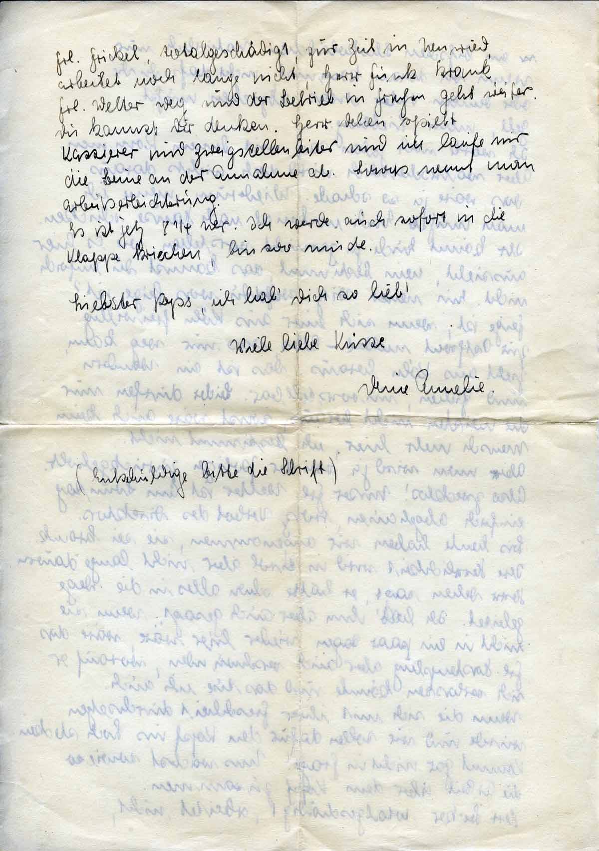 Gestern abend war ich bei Deinen Eltern. Ich hab’ ihnen aus Weiden Johannisbeeren zum Einmachen mitgebracht. Hoffentlich hat die ganze Einmacherei überhaupt noch Sinn. Dein Vater war sehr unglücklich weil er noch keine Post hatte. Heute haben sie aber sicher auch wieder welche. Von den Zigarren, die Du Deinem Vater geschickt hattest, hat er mir welche für meinen Vater mitgegeben. Der war ganz entzückt, so gut haben sie ihm geschmeckt. Ich soll’ Dir extra in seinem Namen dafür danken, er meint nämlich, Du hättest sie persönlich für ihn geschickt. Ich hab’ nun gerade noch einen 20.- Kreditschein. Vielleicht kannst Du ihm noch ein paar Cigärrchen schicken und mir bitte