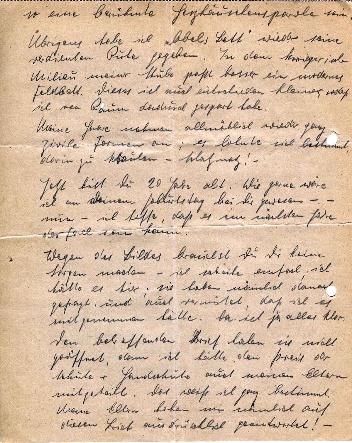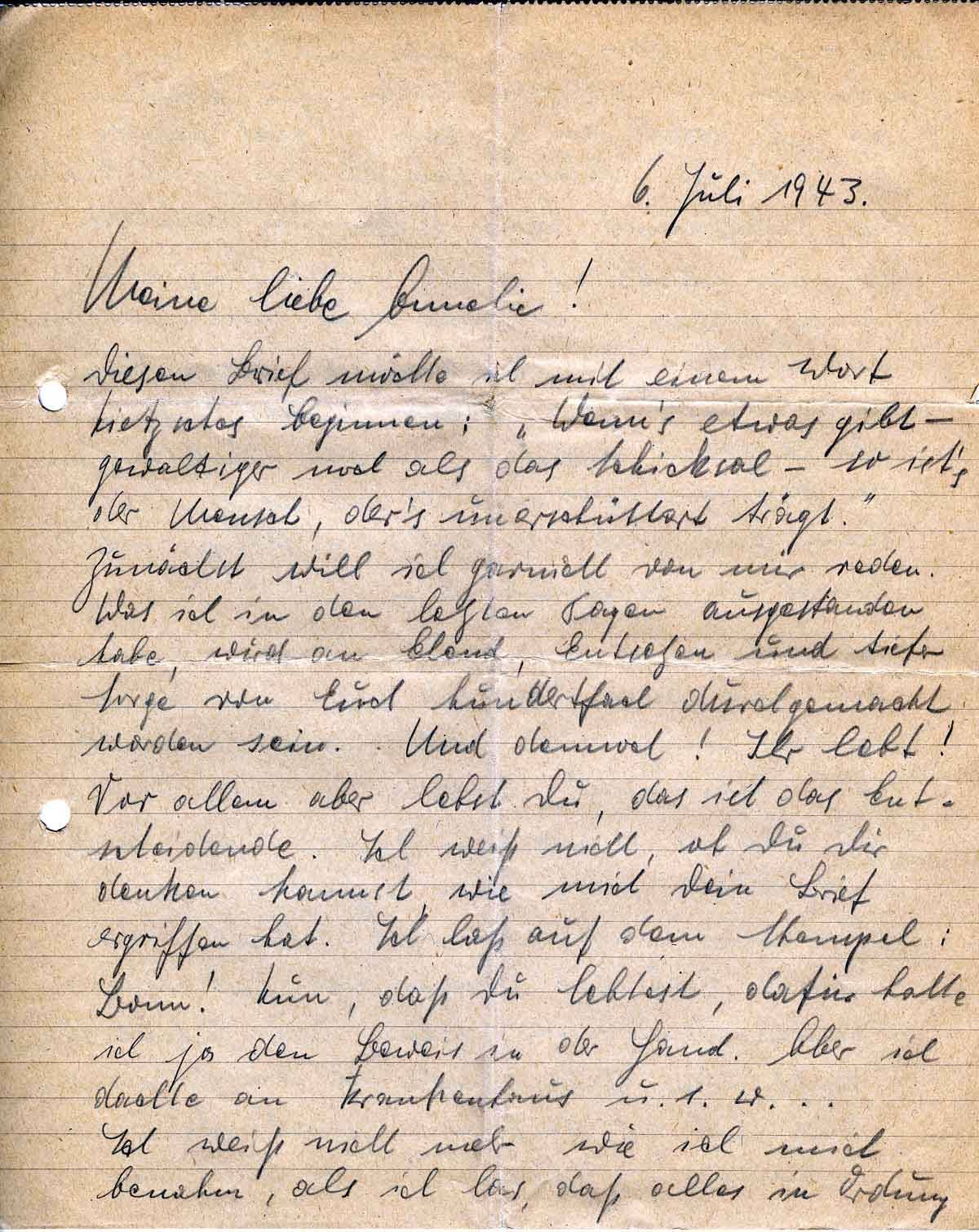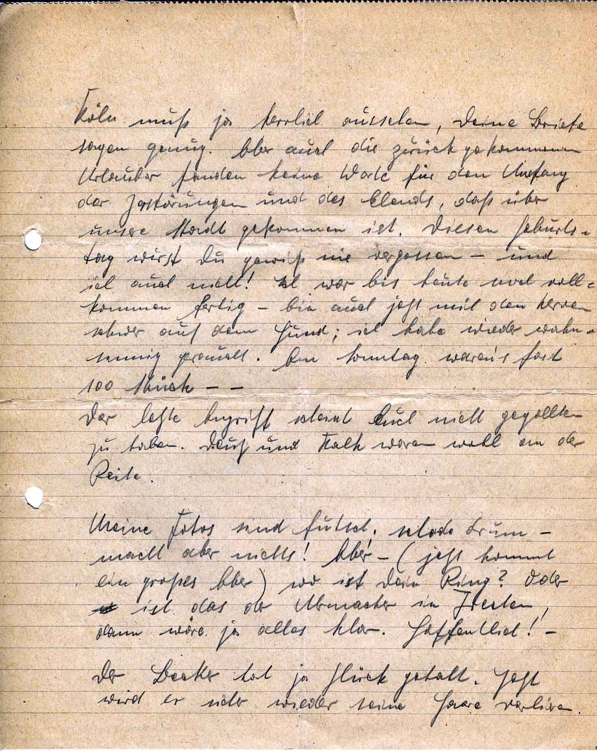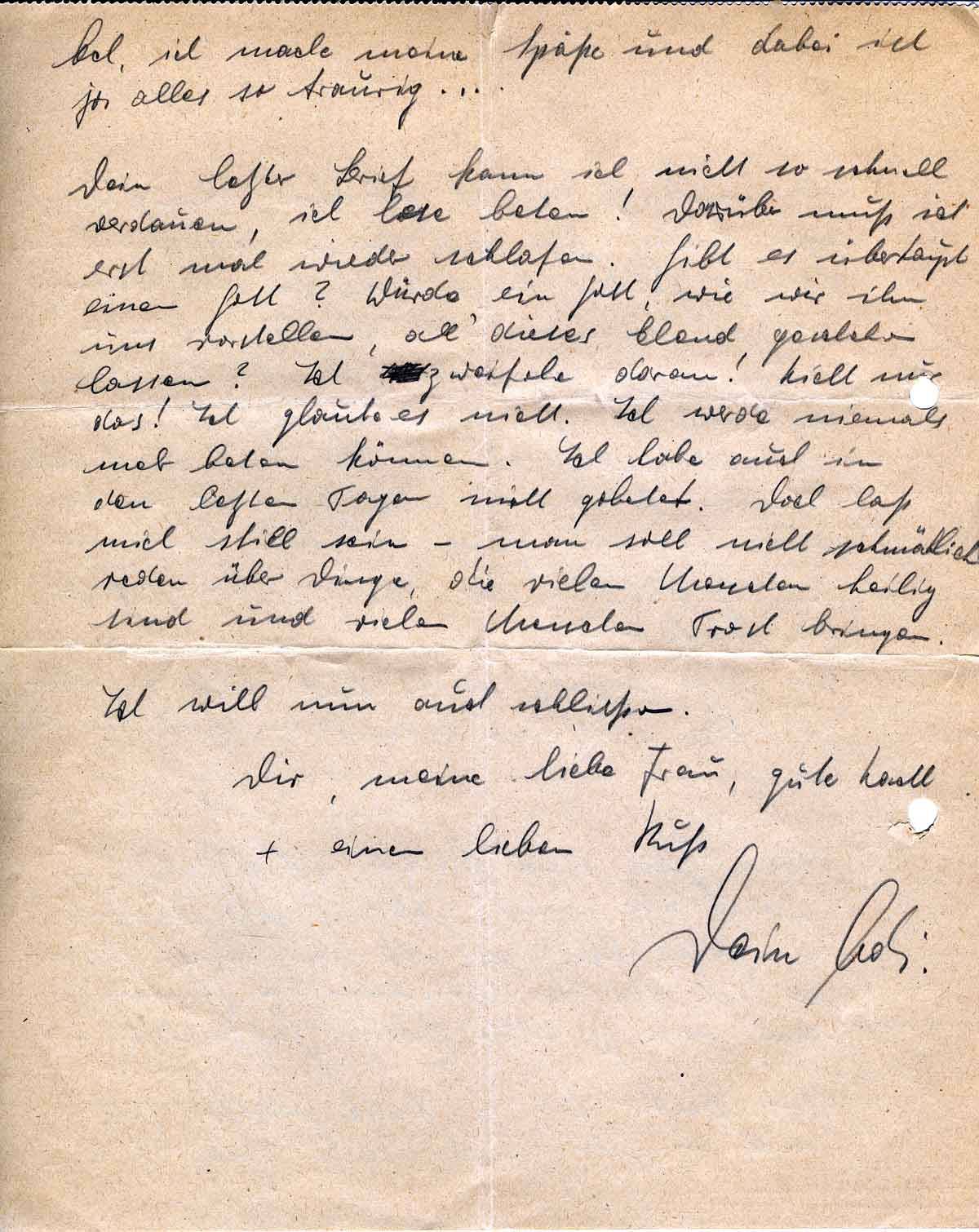 Dein letzter Brief kann ich nicht so schnell verdauen, ich lerne beten! Darüber muß ich erst mal wieder schlafen. Gibt es überhaupt einen Gott? Würde ein Gott, wie wir ihn uns vorstellen, all’ dieses Elend geschehen lassen? Ich zweifele daran! Nicht nur das! Ich glaube es nicht. Ich werde niemals mehr beten können. Ich habe auch in den letzten Tagen nicht gebetet. Doch laß mich still sein - man soll nicht schmählich reden über Dinge, die vielen Menschen heilig sind und vielen Menschen Trost bringen.
