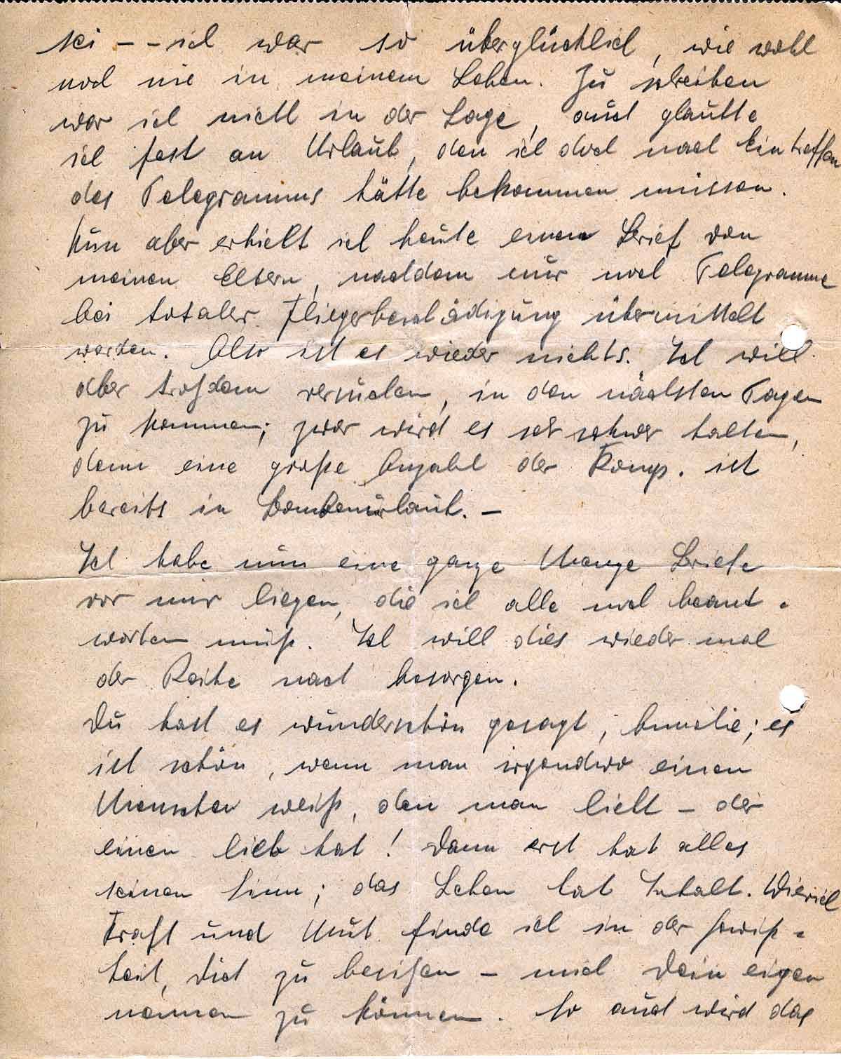 sei - - ich war so überglücklich, wie wohl noch nie in meinem Leben. Zu schreiben war ich nicht in der Lage, auch glaubte ich fast an Urlaub, den ich doch nach Eintreffen des Telegramms hätte bekommen müssen. Nun aber erhielt ich heute einen Brief von meinen Eltern, nachdem nur noch Telegramme bei totaler Fliegerbeschädigung übermittelt werden. Also ist es wieder nichts. Ich will aber trotzdem versuchen, in den nächsten Tagen zu kommen; zwar wird es sehr schwer halten, denn eine große Anzahl der Komp. ist bereits in Bombenurlaub. -