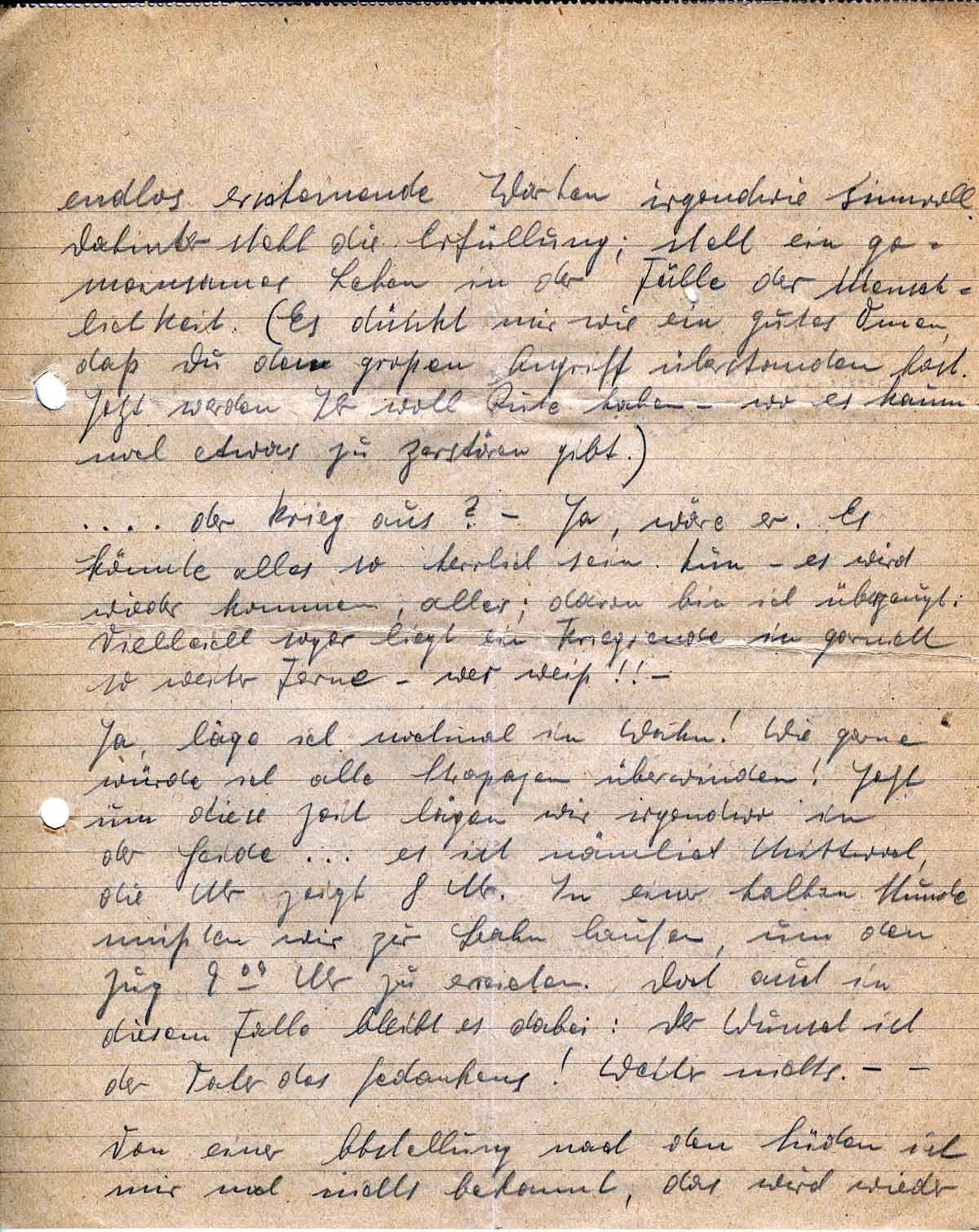 .... der Krieg aus? - Ja, wäre er. Es könnte alles so herrlich sein. Nun - es wird wieder kommen, alles; davon bin ich überzeugt. Vielleicht sogar liegt ein Kriegsende in garnicht so weiter Ferne - wer weiß!! -