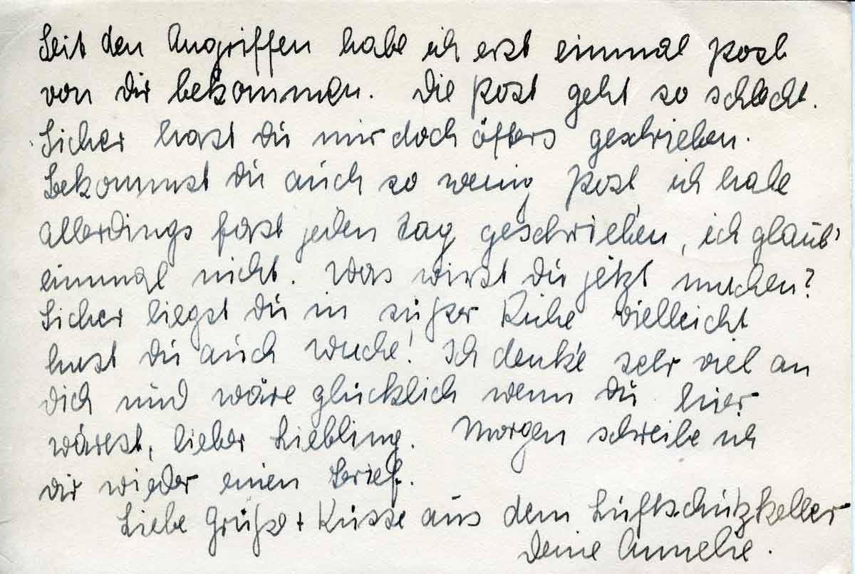 Seit den Angriffen habe ich erst einmal Post von Dir bekommen. Die Post geht so schlecht. Sicher hast Du mir doch öfters geschrieben. Bekommst Du auch so wenig Post ich habe allerdings fast jeden Tag geschrieben, ich glaub‘ einmal nicht. Was wirst Du jetzt machen? Sicher liegst Du in süßer Ruhe vielleicht hast Du auch Wache! Ich denke sehr viel an Dich und wäre glücklich wenn Du hier wärest, lieber Liebling. Morgen schreibe ich wieder einen Brief.